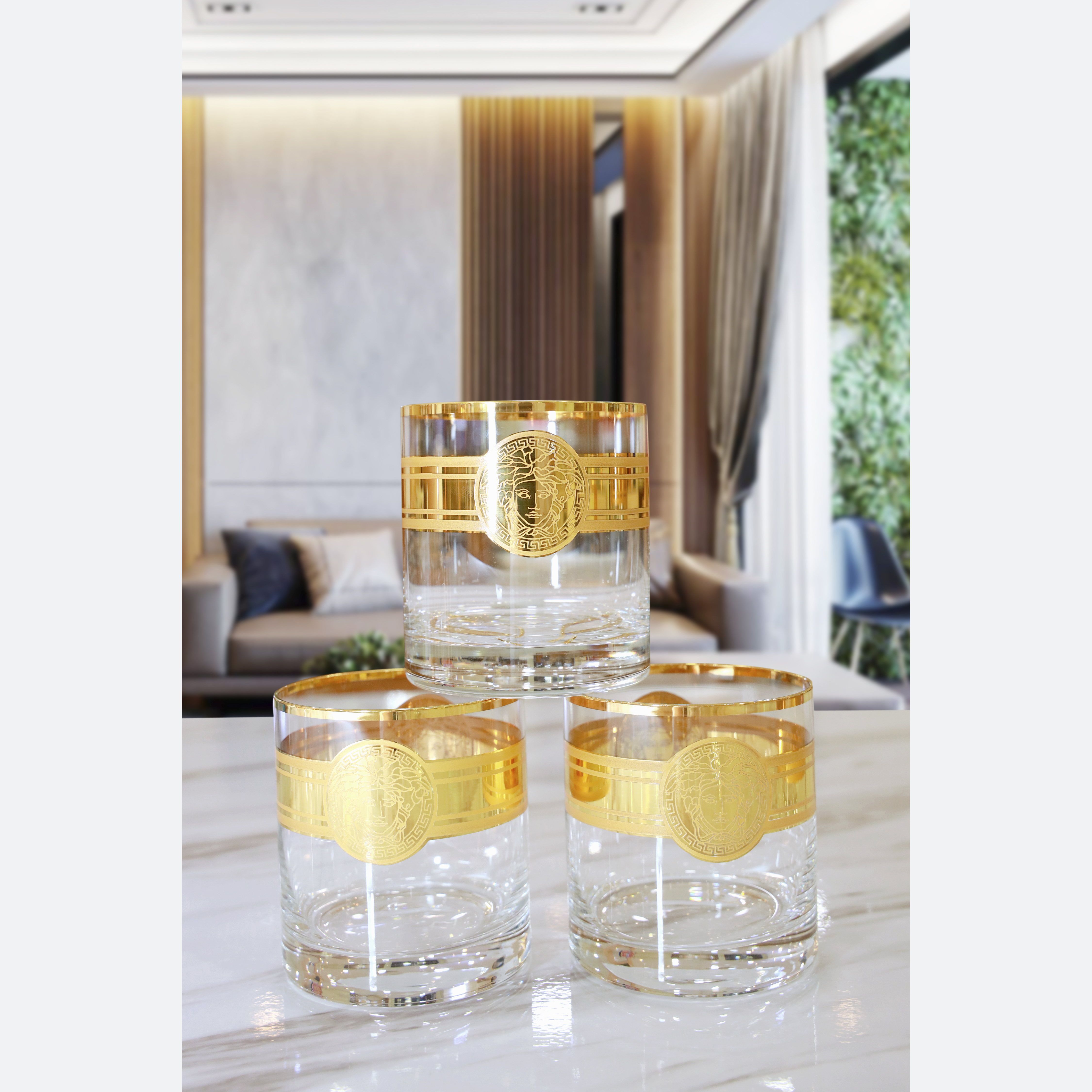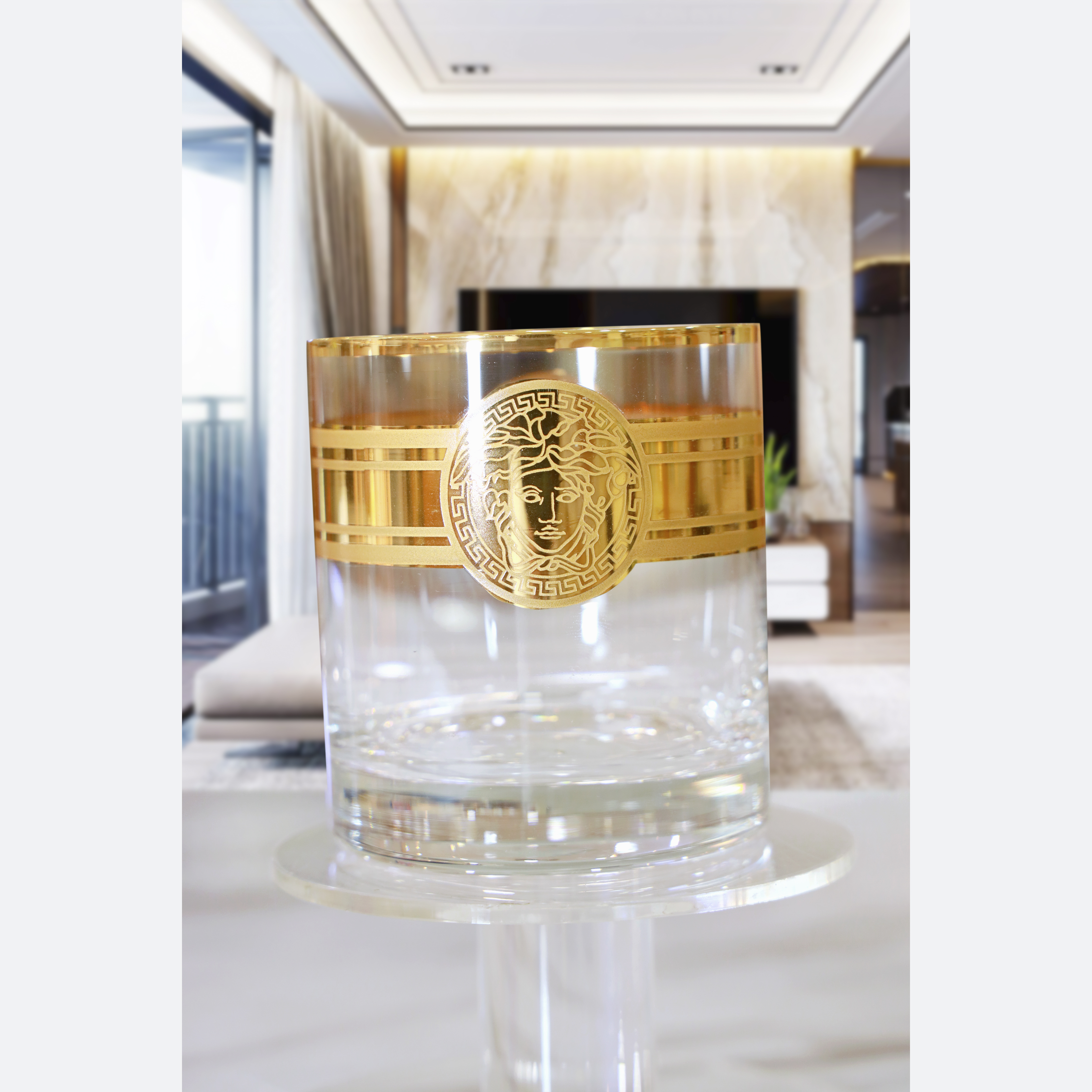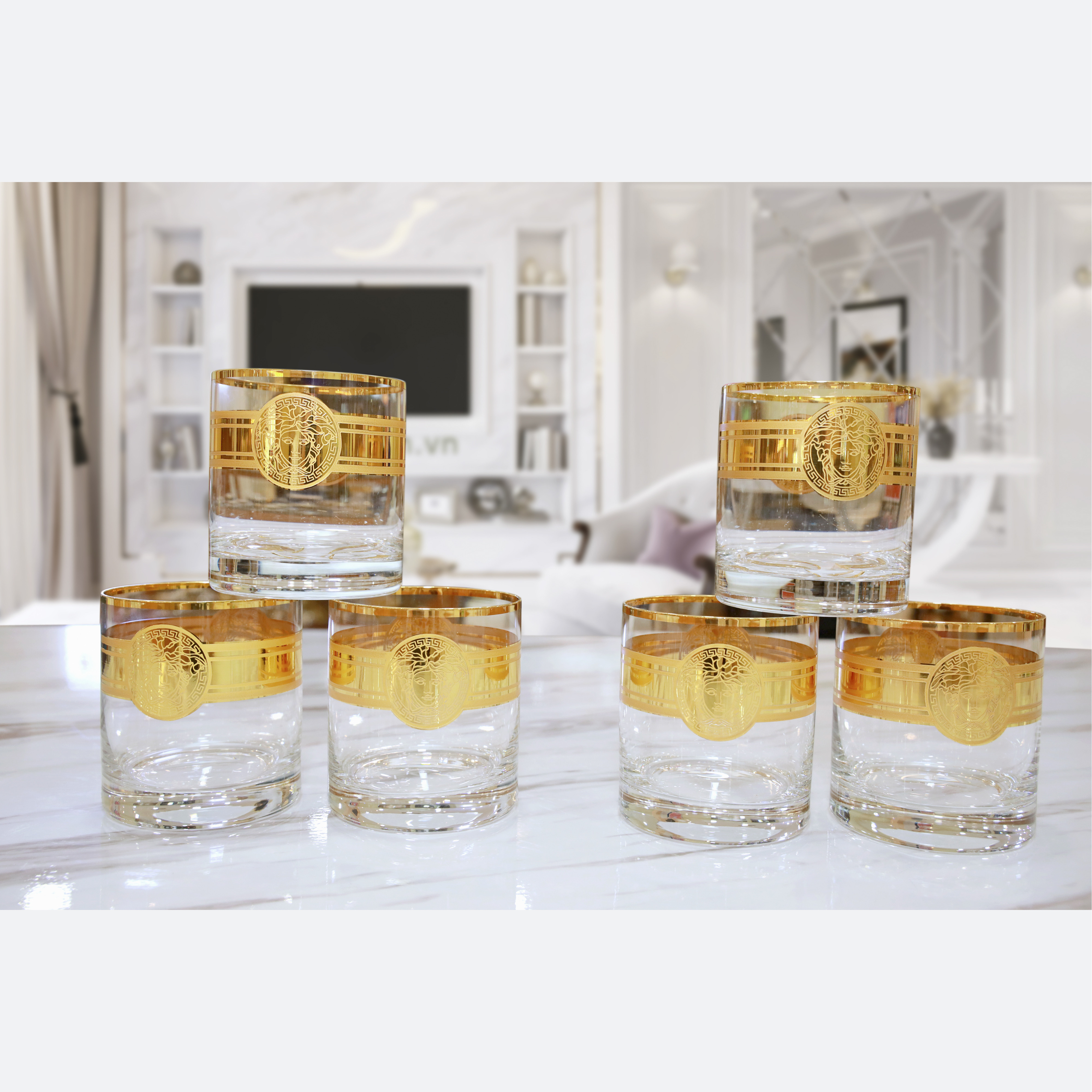 Hoa văn: Thân cốc mạ vàng 2 mặt Versace, hình ảnh mạ sắc nét, kết nối 2 mặt Versace là đường mạ vàng với điểm nhấn là 2 đường chỉ mài mờ
