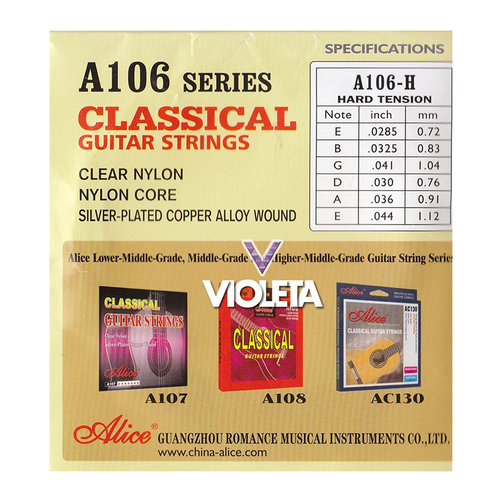 - Dây đàn guitar classic Alice A106 là dòng sản phẩm dây nylon của hãng Alice. Các dây đàn E-1, B-2, G-3 được làm từ nylon nhập khẩu, và D-4, A-5, E-6 được quấn tự động bằng đồng mạ bạc.