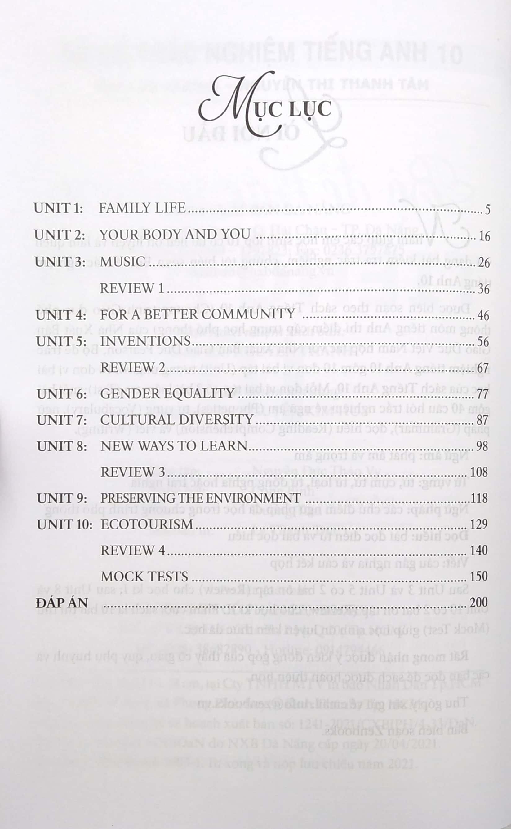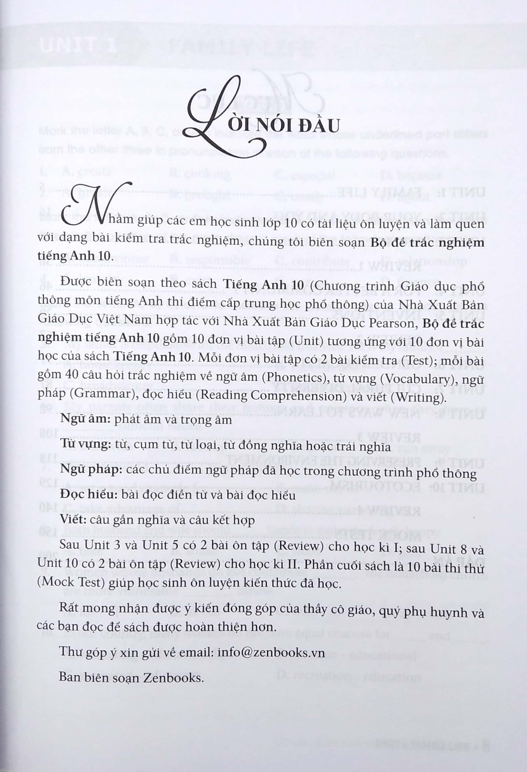 Được biên soạn theo sách Tiếng Anh 10 (Chương trình Giáo dục phổ thông môn tiếng Anh thí điểm cấp trung học phổ thông) của Nhà Xuất Bản Giáo Dục Việt Nam hợp tác với Nhà Xuất Bản Giáo Dục Pearson, Bộ đề trắc nghiệm tiếng Anh 10 gồm 10 đơn vị bài tập (Unit) tương ứng với 10 đơn vị bài học của sách Tiếng Anh 10. Mỗi đơn vị bài tập có 2 bài kiểm tra (Test); mỗi bài gồm 40 câu hỏi trắc nghiệm về ngữ âm (Phonetics), từ vựng (Vocabulary), ngữ pháp (Grammar), đọc hiểu (Reading Comprehension) và viết (Writing).