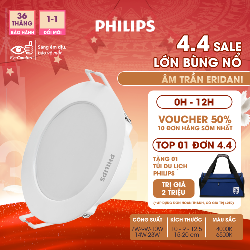 Bộ đèn âm trần Philips LED Eridani hiệu suất ánh sáng cao - Công suất (7W, 9W, 10W, 14W. 23W) với giá cả phải chăng và chất lượng tốt mang lại tính kinh tế và lợi ích sử dụng cao.