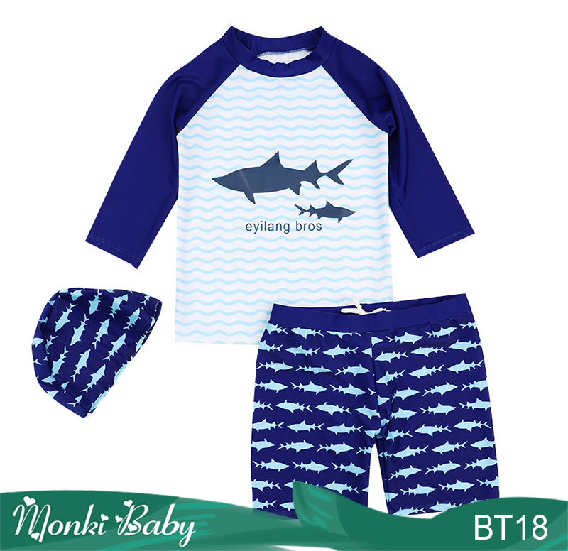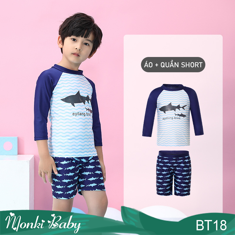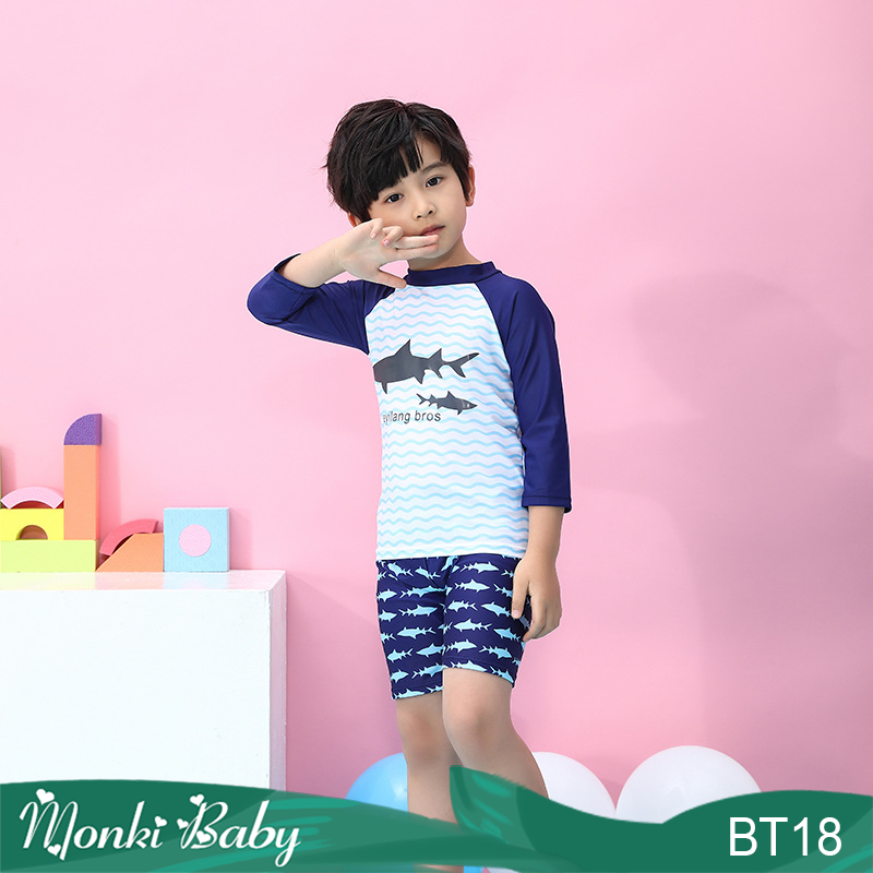 Thông số kỹ thuật Bộ đồ bơi bé trai dài tay cá mập, vải bơi co giãn 4 chiều, có mũ bơi | BT18