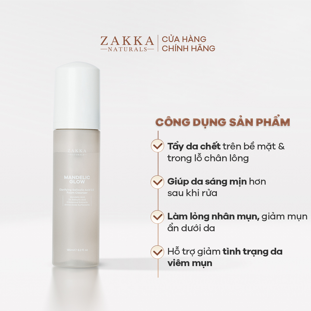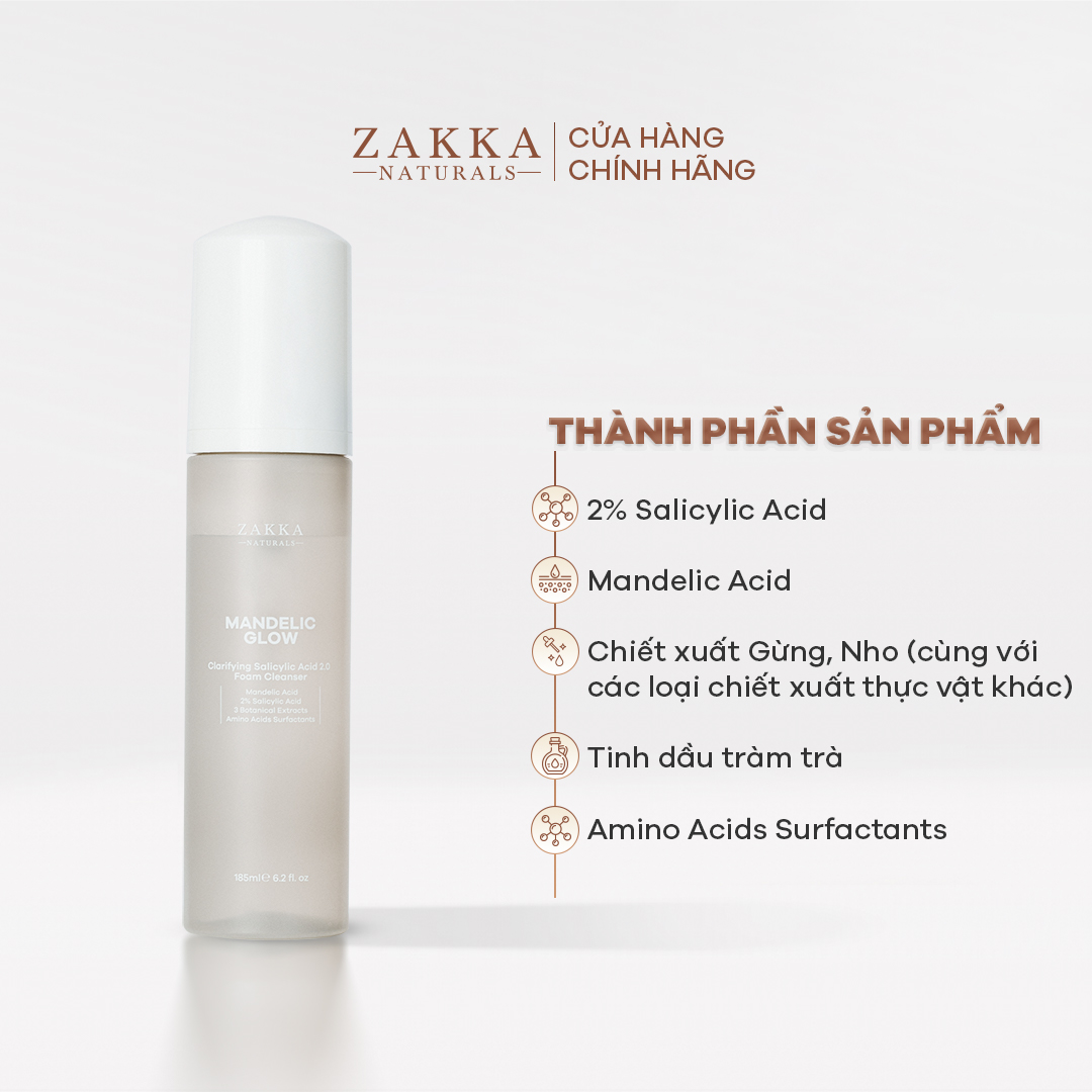 2. Sữa Rửa Mặt Tạo Bọt Zakka Naturals BHA, AHA Mandelic Glow Foam Cleanser 185ml