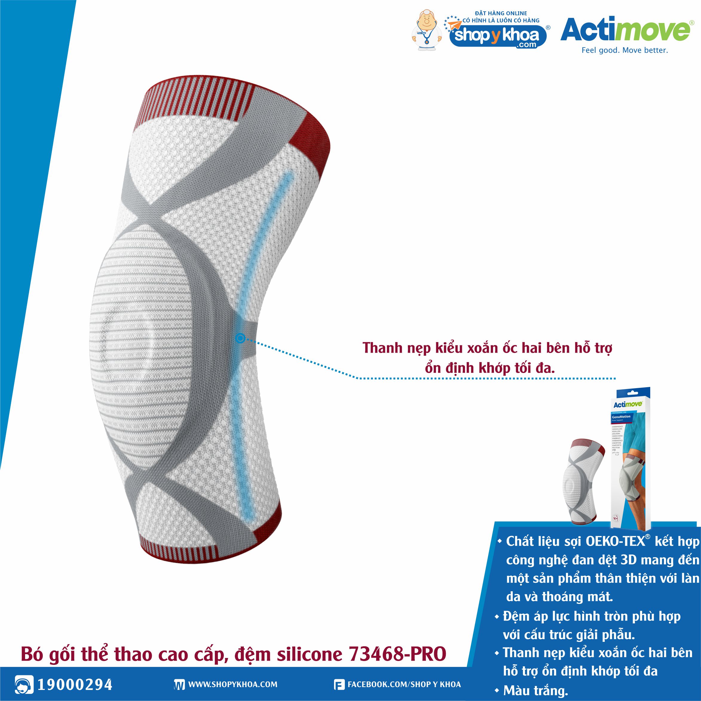 Cấu trúc dệt sáng tạo của Actimove GenuMotion thiết kế hỗ trợ vùng khớp gối bao gồm sự vừa vặn hoàn hảo với áp lực tăng dần cho phép cải thiện sự tuần hoàn máu và bạch huyết giúp giảm đau tốt hơn. Đường nét phù hợp giải phẫu hỗ trợ các cử động tự nhiên và mang lại sự thoải mái vượt trội, sản phẩm này thích hợp cho nhiều size khác nhau.