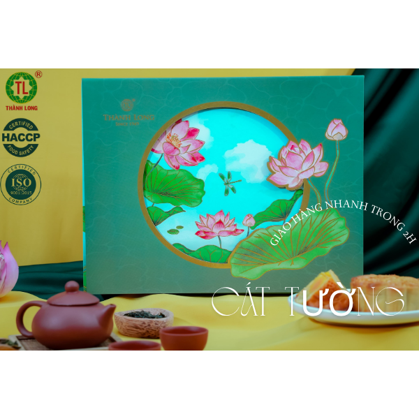 Thông số kỹ thuật Bộ hộp Bánh trung thu Cát Tường cao cắp 4 bánh 2 trứng 220g - Thành Long - 880g - tặng 1 hộp trà - VIỆT NAM