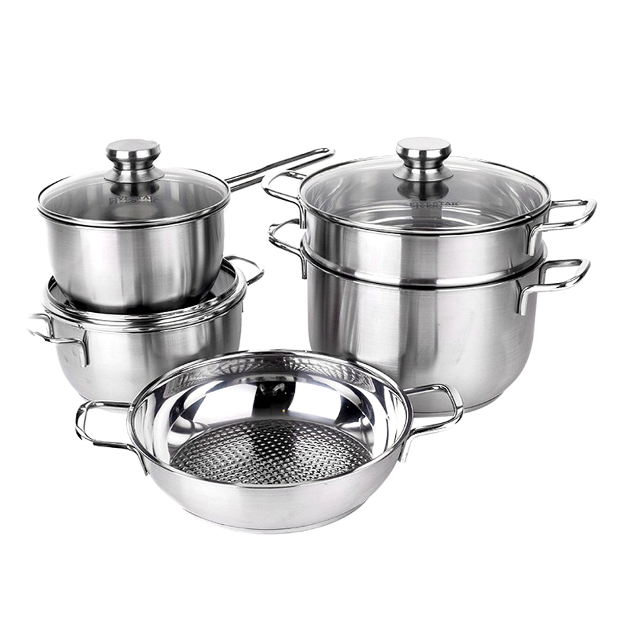 - Bộ nồi làm bằng inox 430 sáng bóng, an toàn cho sức khỏe, không làm biến đổi hương vị món ăn được nấu trong nồi, độ dày 0.8 mm.