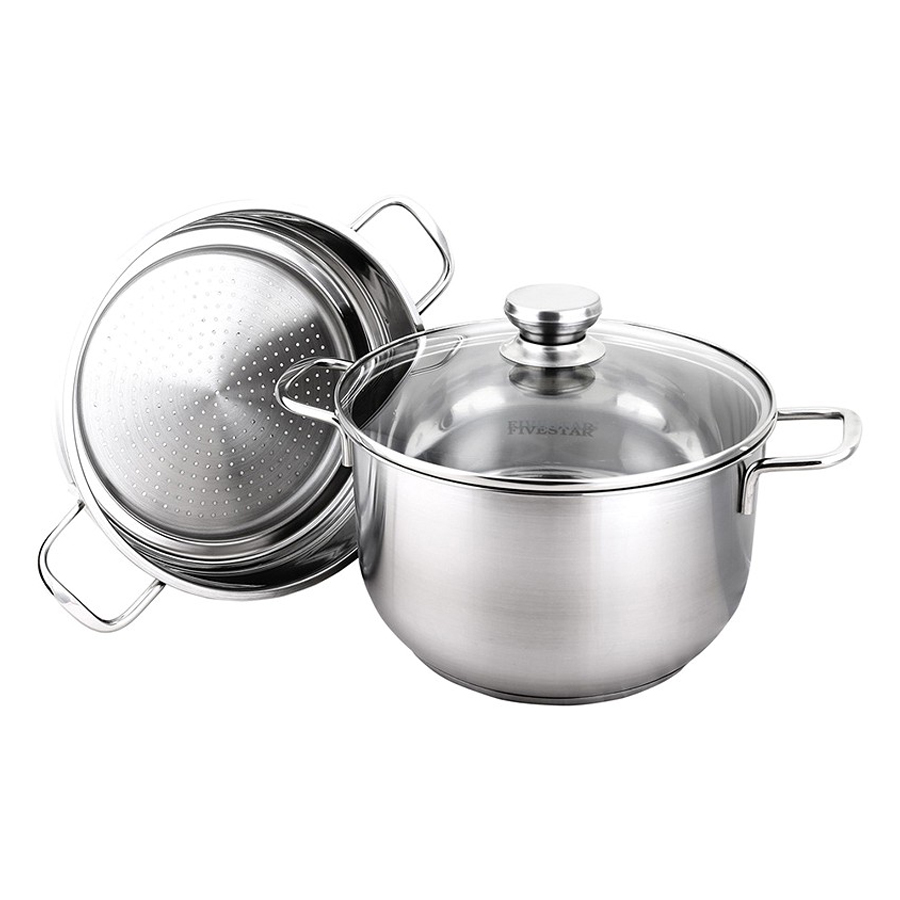 - Bộ Nồi Inox 3 Đáy Gồm 3 Nồi 1 Chảo 1 Xửng Fivestar FS08CG1 5 sản phẩm, bạn có thể dùng bộ 2 nồi xửng để hấp bánh bao tầm 6 cái, dùng nồi luộc gà khoảng 1.5 kg trở lên. Chảo chiên 4 cái đùi gà, nồi 20 cm thích hợp để nấu canh, hầm thịt dưới 1 kg, quánh nấu cháo cho bé.