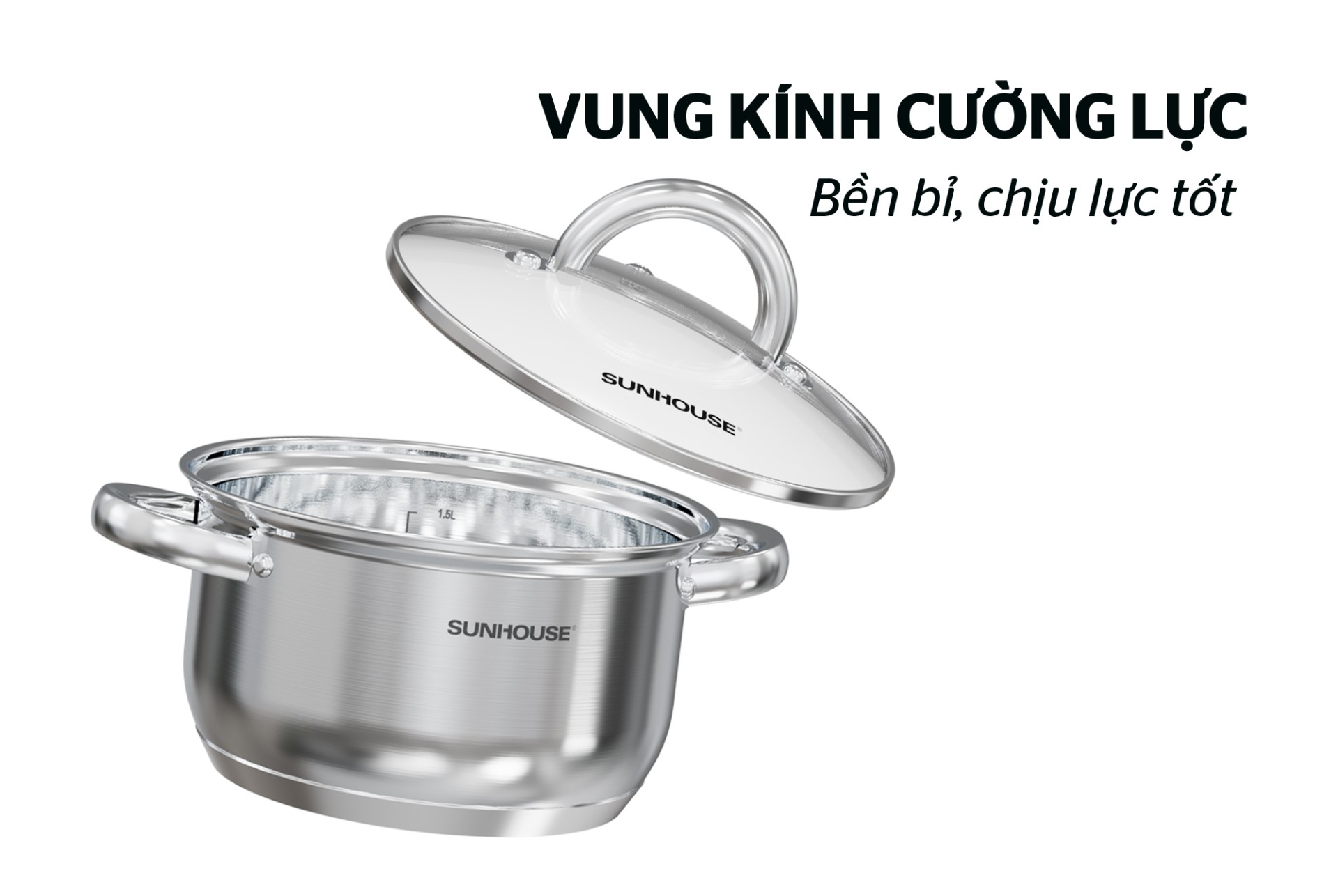 Bộ nồi được trang bị vung kính cường lực viên Inox chắc chắn, hạn chế nứt vỡ, trầy xước khi va đập. Vung kính trong suốt, sáng bóng giúp bạn dễ dàng quan sát thực phẩm trong quá trình nấu nướng.