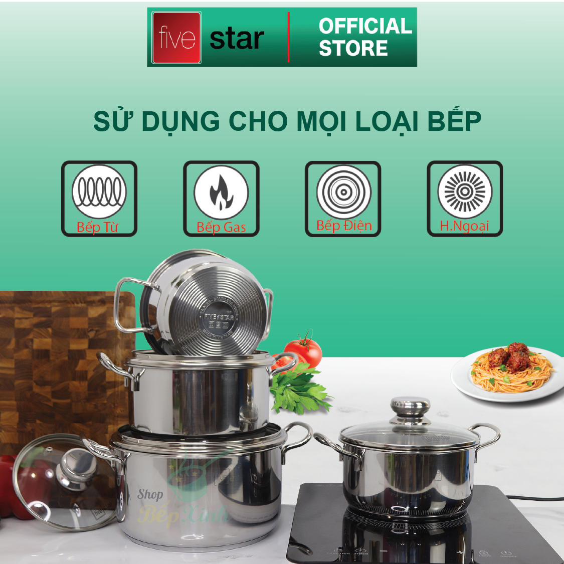 Thông số kỹ thuật Bộ Nồi Inox 430 Bếp Từ 3 Đáy 3 Món Nắp Kính Fivestar Tặng 2 Muỗng Canh