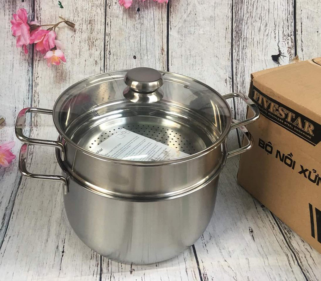 - Bộ Nồi Xửng 3 Đáy Nắp Kính Fivestar thiết kế sang trọng, đẹp mắt tiện dụng với 1 nồi và 1 xửng hấp.