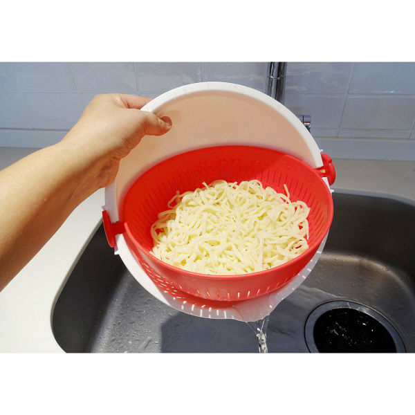 Cho rau vào rổ, đậy nắp chặt đúng khớp. Nhẹ nhàng quay tay cầm làm ráo nước cho rau, sau đó chắt hết nước dư thừa qua miệng rót. Có thể tháo nắp vặn ở miệng rót ra, châm thêm nước vào, rửa thêm lần nữa