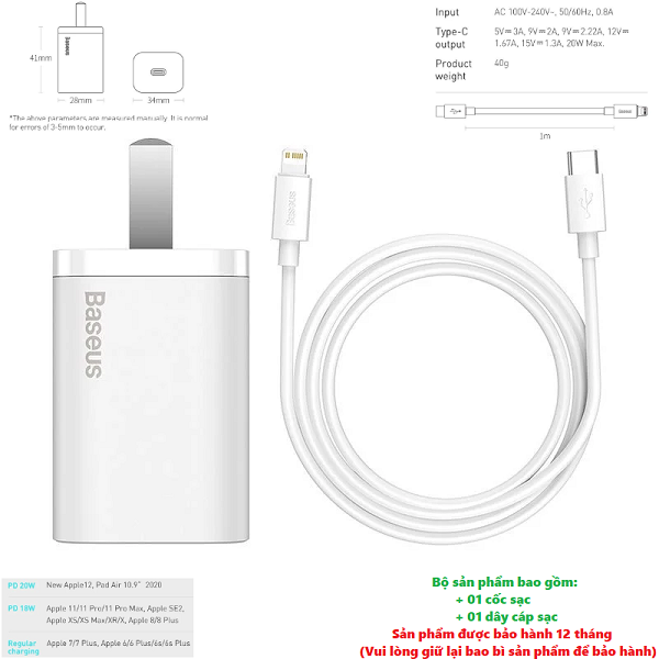 Thông số kỹ thuật Bộ sạc nhanh 20W USB Type C Baseus Super SI Quick Charger QC3.0 cho iPhone 12 (1C, 20W, Chân dẹt) - Hàng chính hãng