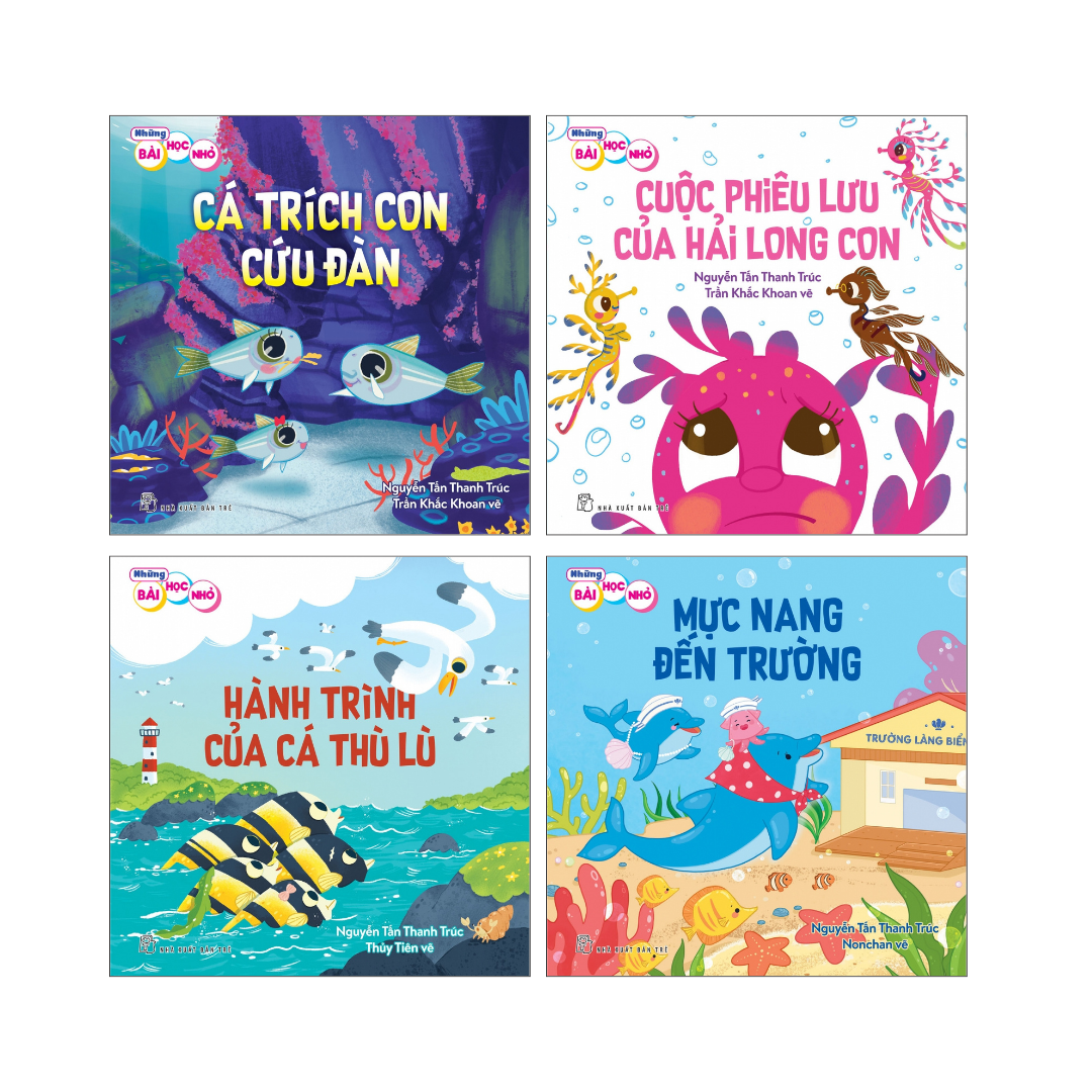 - Mực nang đến trường: Nơi đáy biển, ngày khai trường đã đến rồi, các bạn nhỏ cá cua tôm mực đều háo hức theo bố mẹ tới trường. Chỉ có một mình, đứng ở cổng trường, bé Mực nang buồn rầu nhìn các bạn. Làm thế nào để bé được đến trường đây?