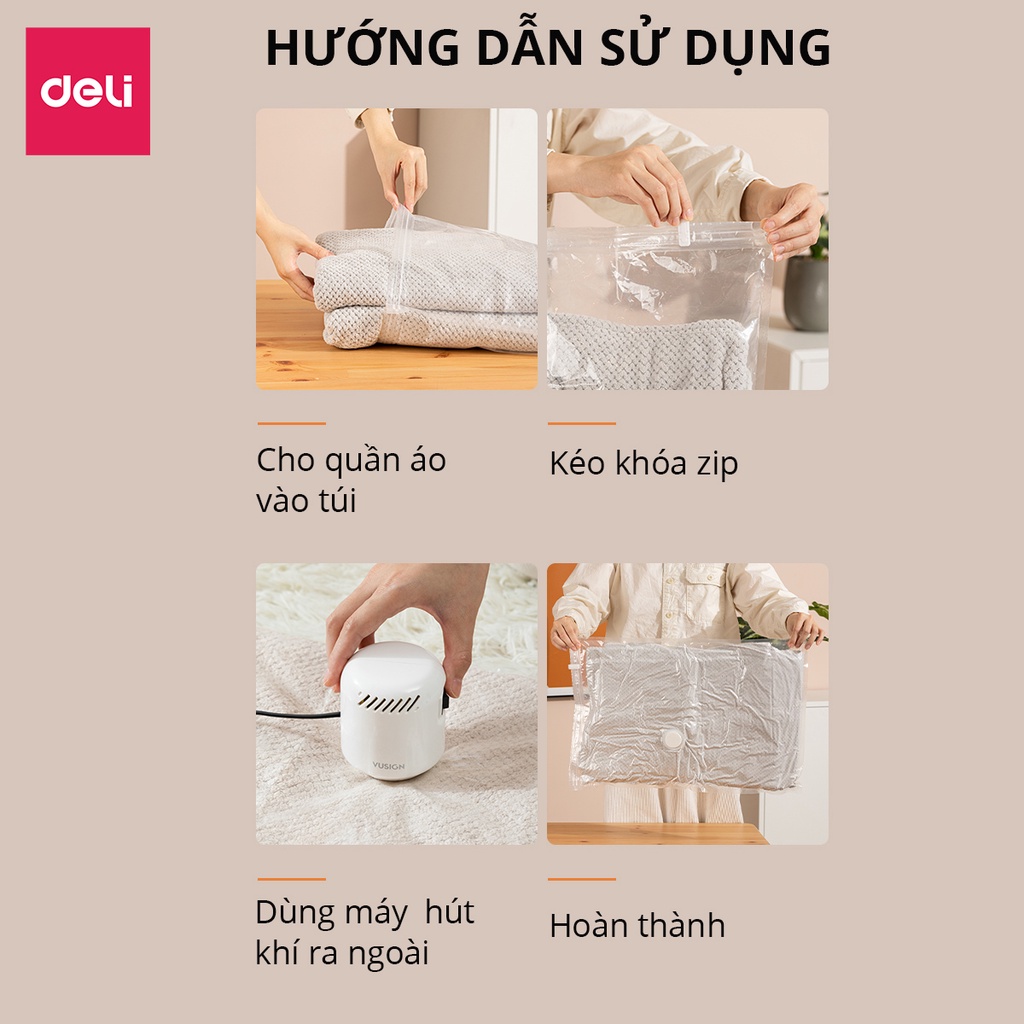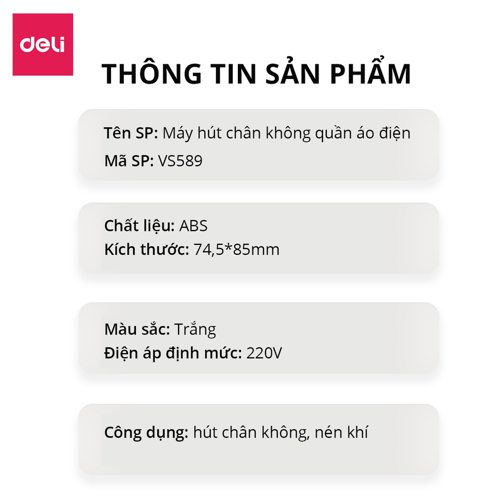 Thông số kỹ thuật Bơm Điện - Bơm Tay Hút Chân Không Quần Áo Chăn Ga Gối Đệm Thú Bông Mành Rèm Deli - Phù Hợp Với Túi Hút Chân Không Đựng Quần Áo