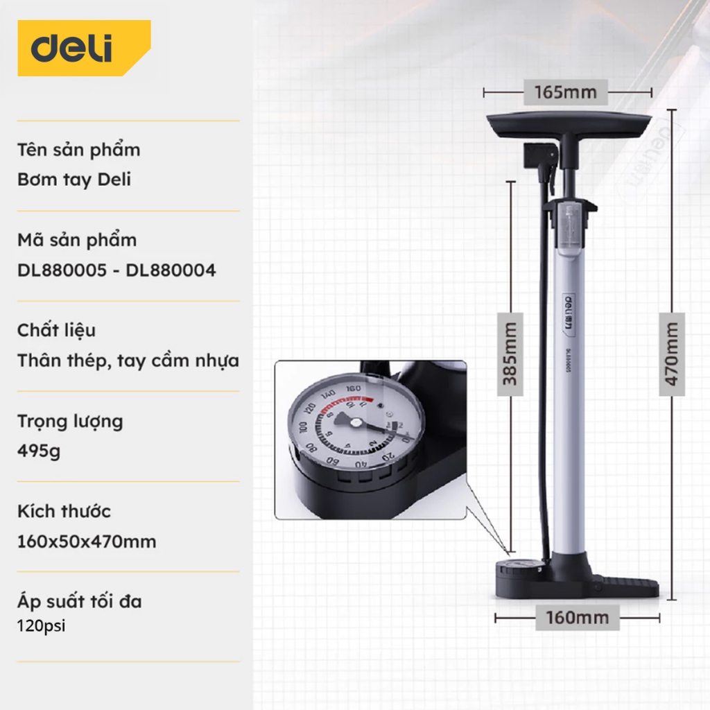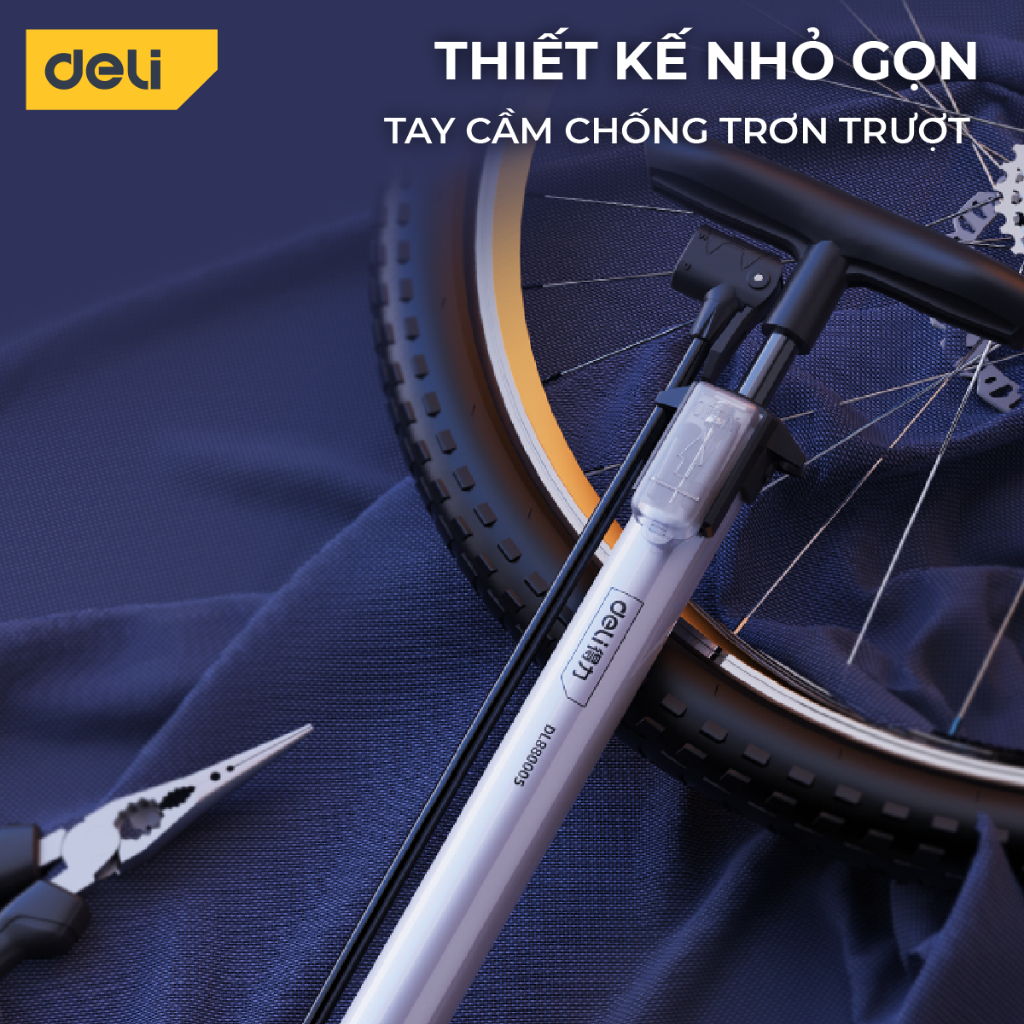 Thông số kỹ thuật Bơm Xe Đạp Xe Máy Deli Tools Tích Hợp Đồng Hồ Áp Suất Tối Đa 160psi Nhỏ Gọn Dễ Dàng Mang Theo Mọi Nơi DL880005