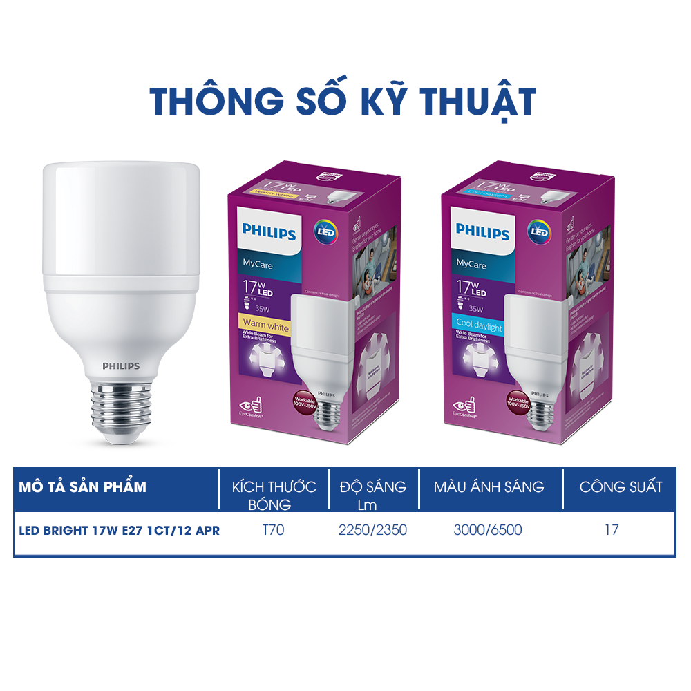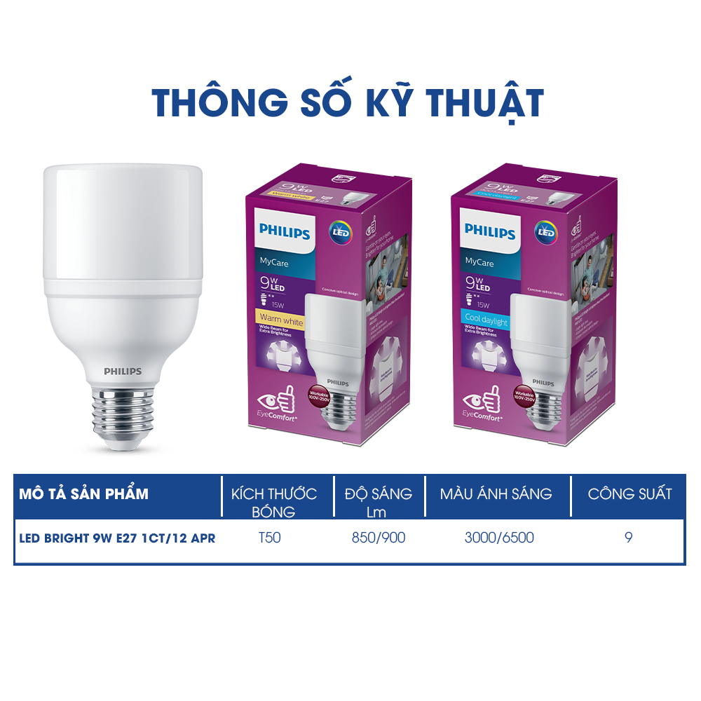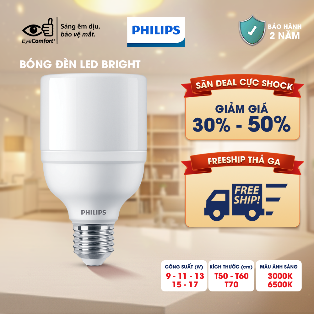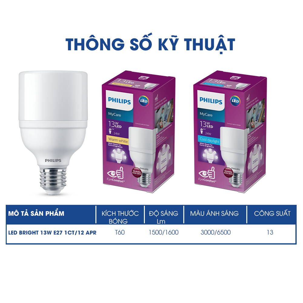 Thông số kỹ thuật Bóng đèn Philips LED Bright E27 bảo vệ mắt, ánh sáng vàng, ánh sáng trắng (01 bóng)