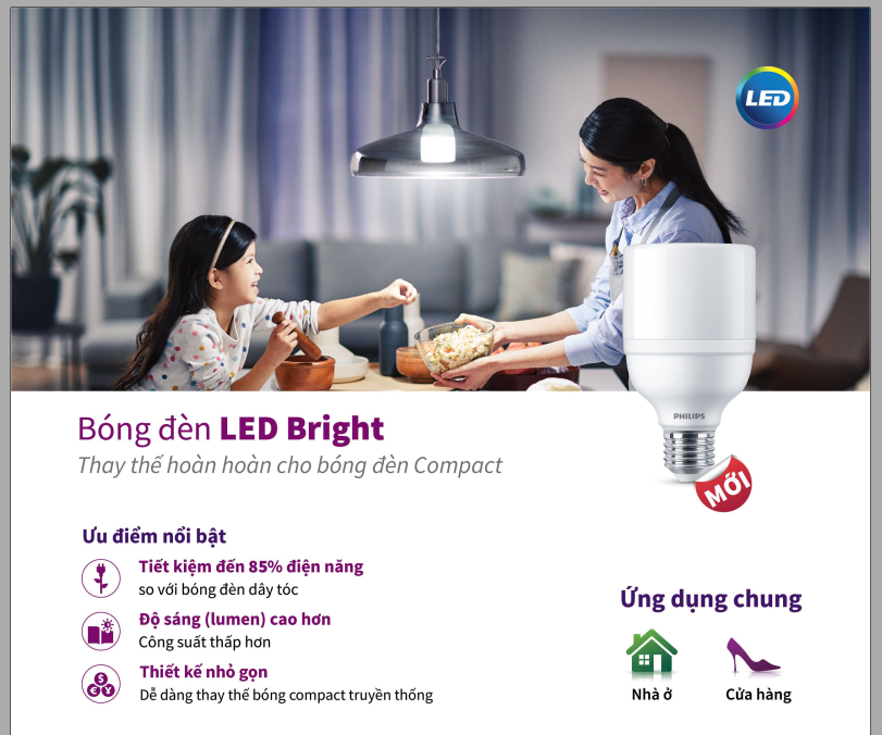 Bóng đèn LED Bright thay thế hoàn toàn cho bóng compact.