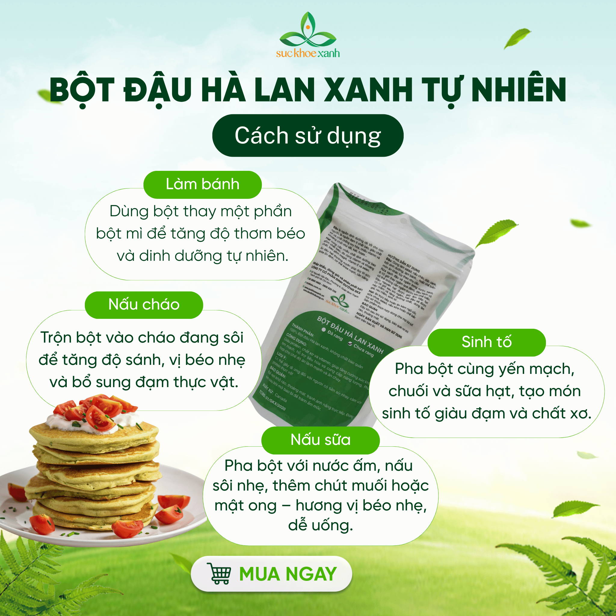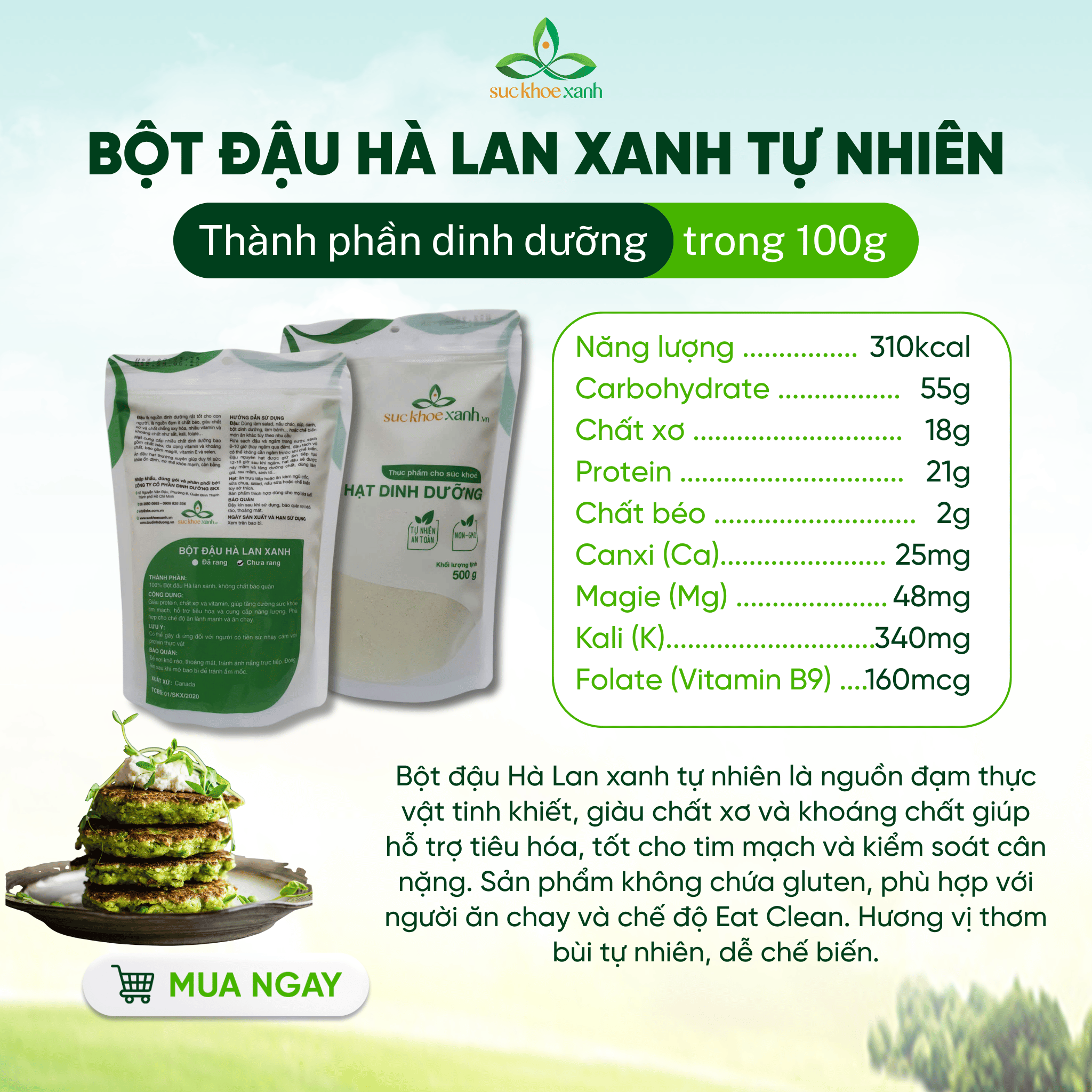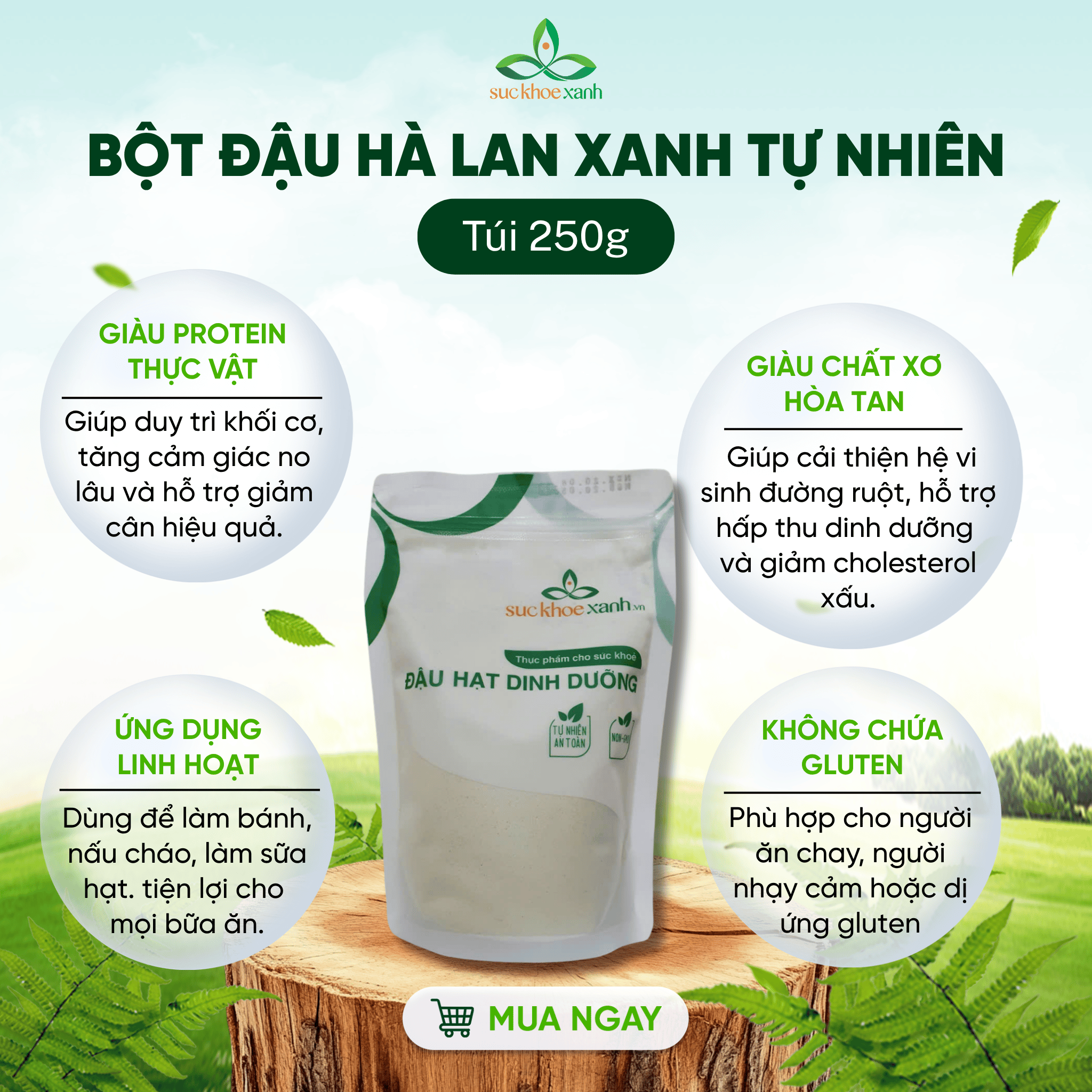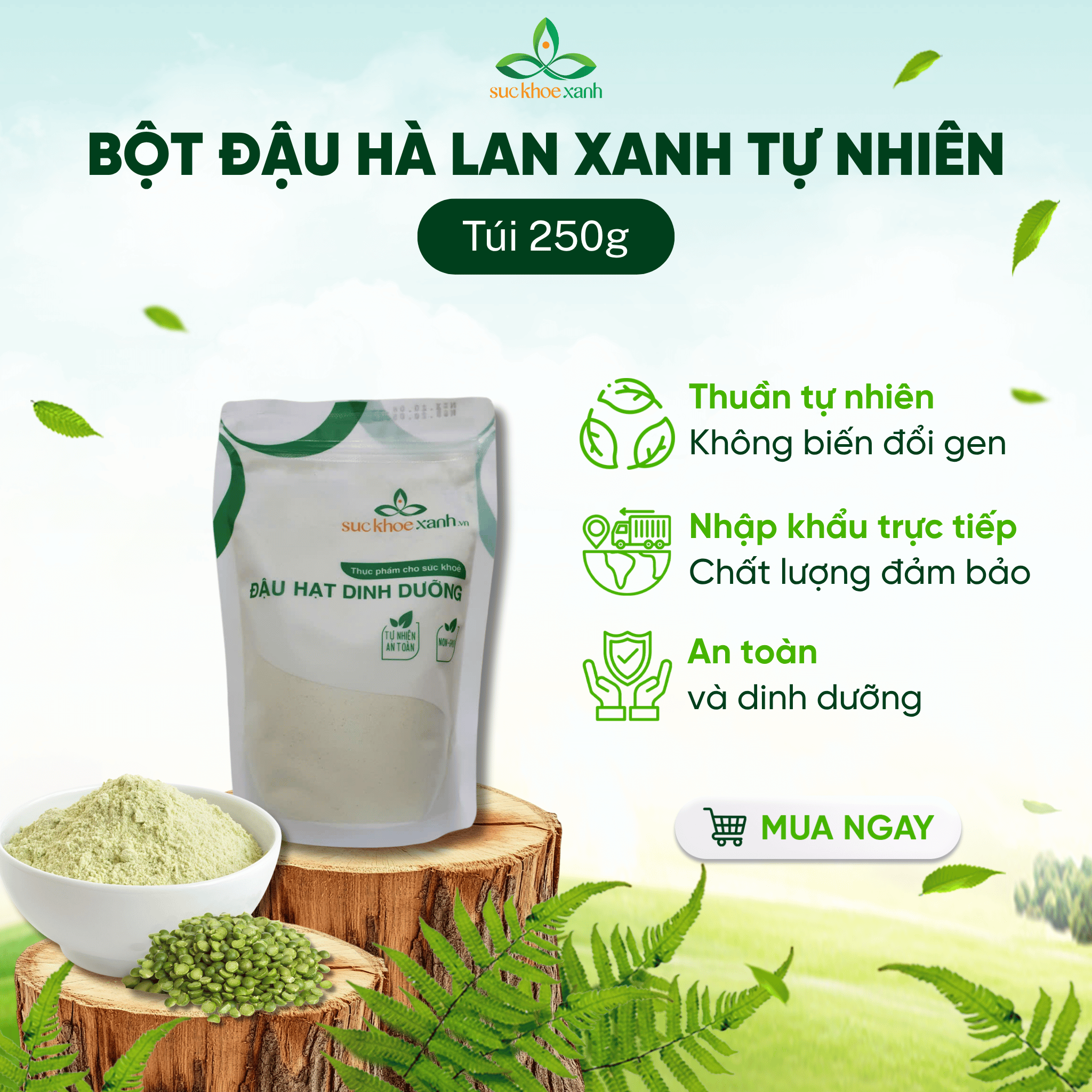 - Bổ Sung Dinh Dưỡng: Bột Đậu Hà Lan Xanh là nguồn cung cấp protein và chất xơ dồi dào, hỗ trợ sức khỏe tim mạch và tiêu hóa.
