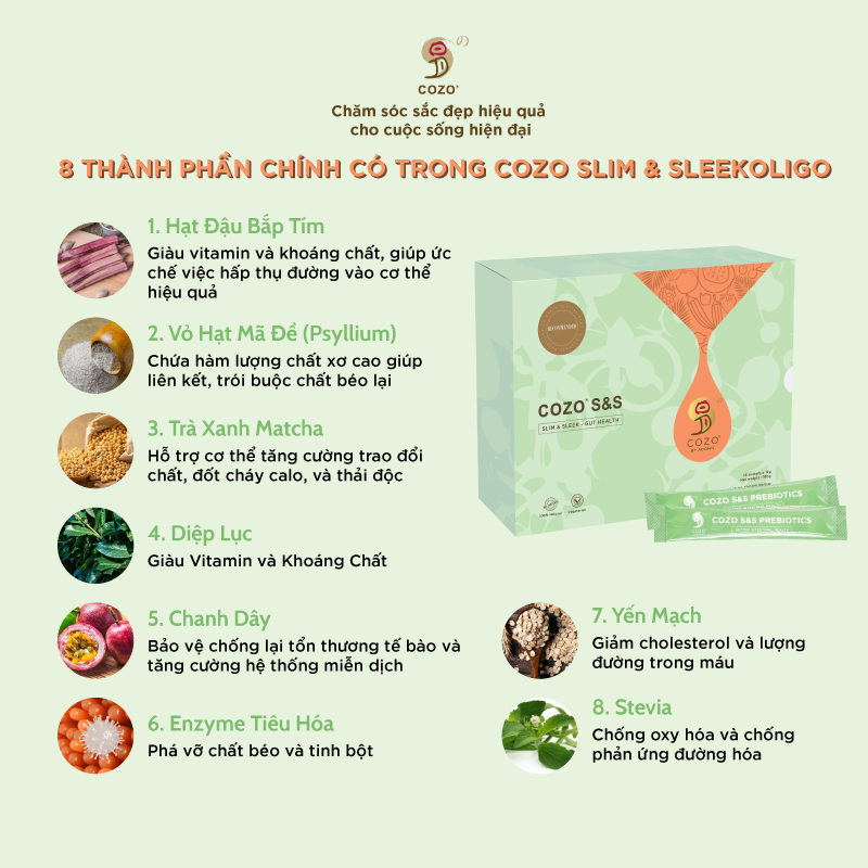 Với công thức độc quyền Cozo Slim & Sleek Prebiotic Jelly hỗ trợ làm sạch đường ruột, tạo điều kiện cho sự phát triển lành mạnh của chủng lợi khuẩn prebiotic, men vi sinh, thúc đẩy hệ tiêu hóa hiệu quả và giảm đáng kể lượng carbohydrate cũng như nguy cơ tiểu đường. Thạch Giảm Cân Cozo Slim & Sleek Giàu oligosaccharides, prebiotics và chất xơ, cùng nhiều vitamin tổng hợp khác, đóng vai trò như một nguồn dinh dưỡng hữu ích cho sức khỏe đường ruột hằng ngày.