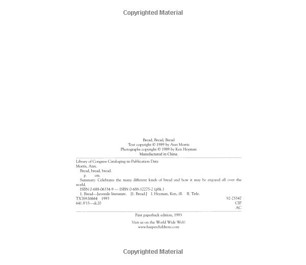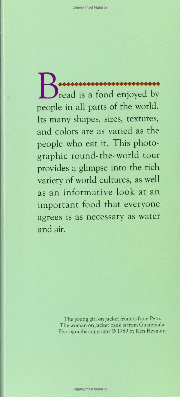 Bread is a food enjoyed by people in all parts of the world. Its many shapes, sizes, textures, and colors are as varied as the people who eat it. This photographic round-the-world tour provides a glimpse into the rich variety of world cultures, as well as an informative look at an important food that everyone agrees is as necessary as water and air.Supports the Common Core State Standards.Giá sản phẩm trên Tiki đã bao gồm thuế theo luật hiện hành. Bên cạnh đó, tuỳ vào loại sản phẩm, hình thức và địa chỉ giao hàng mà có thể phát sinh thêm chi phí khác như phí vận chuyển, phụ phí hàng cồng kềnh, thuế nhập khẩu (đối với đơn hàng giao từ nước ngoài có giá trị trên 1 triệu đồng).....