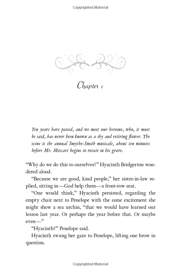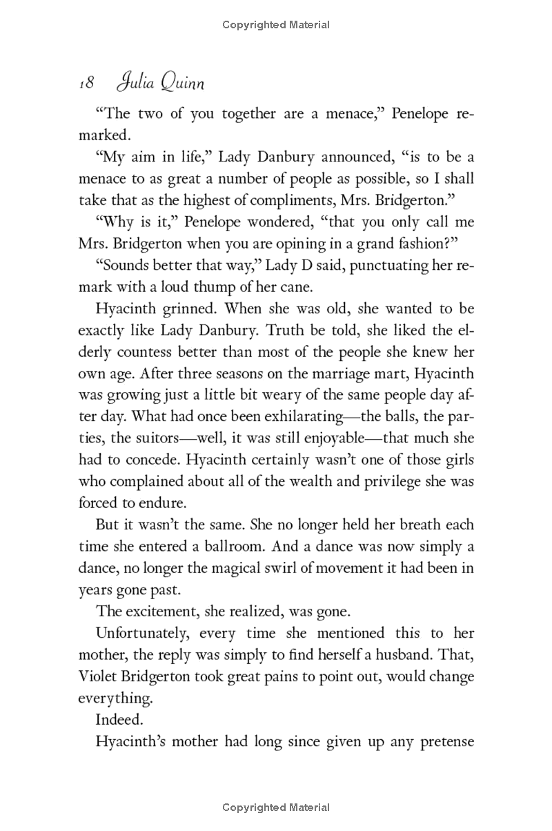 All the ton agreed: there was no one quite like Hyacinth Bridgerton. She’s fiendishly smart, devilishly outspoken, and according to Gareth, probably best in small doses. But there’s something about her—something charming and vexing—that grabs him and won’t quite let go . . .