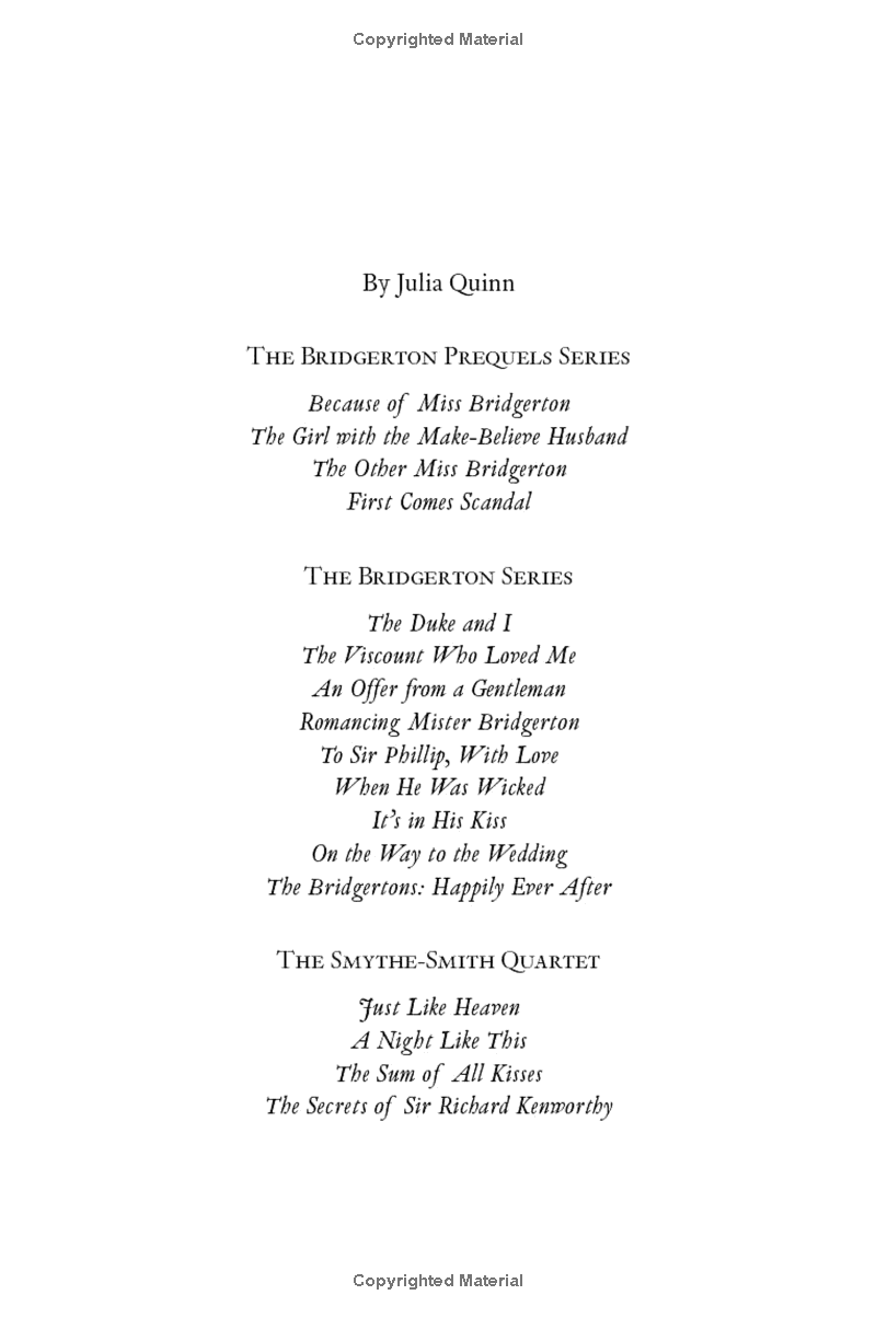 Or don’t. But rest assured, he’s spinning in his grave when Gareth and Hyacinth cross paths at the annual—and annually discordant—Smythe-Smith musicale. To Hyacinth, Gareth’s every word seems a dare, and she offers to translate his diary, even though her Italian is slightly less than perfect. But as they delve into the mysterious text, they discover that the answers they seek lie not in the diary, but in each other . . . and that there is nothing as simple—or as complicated—as a single, perfect kiss.