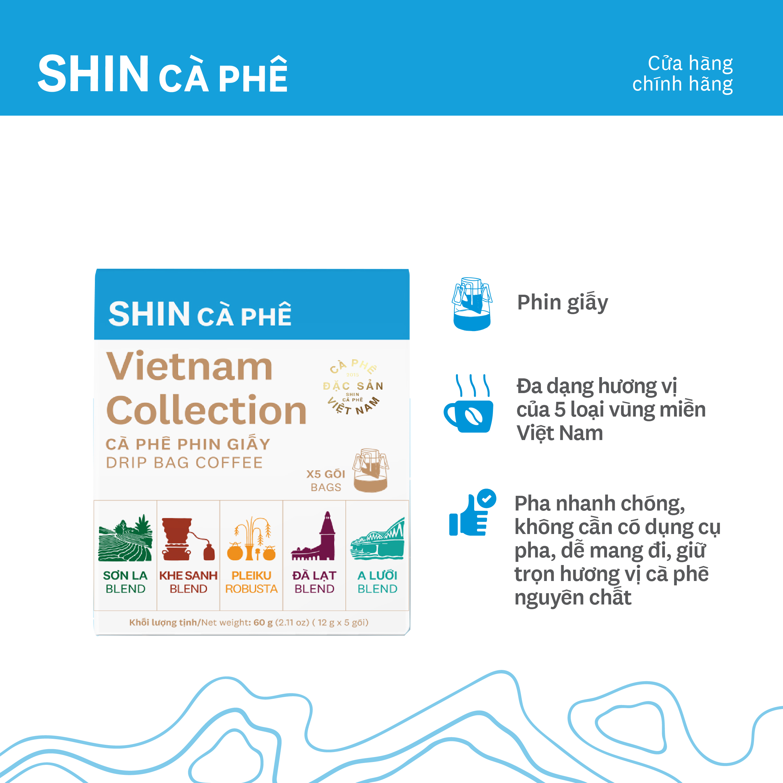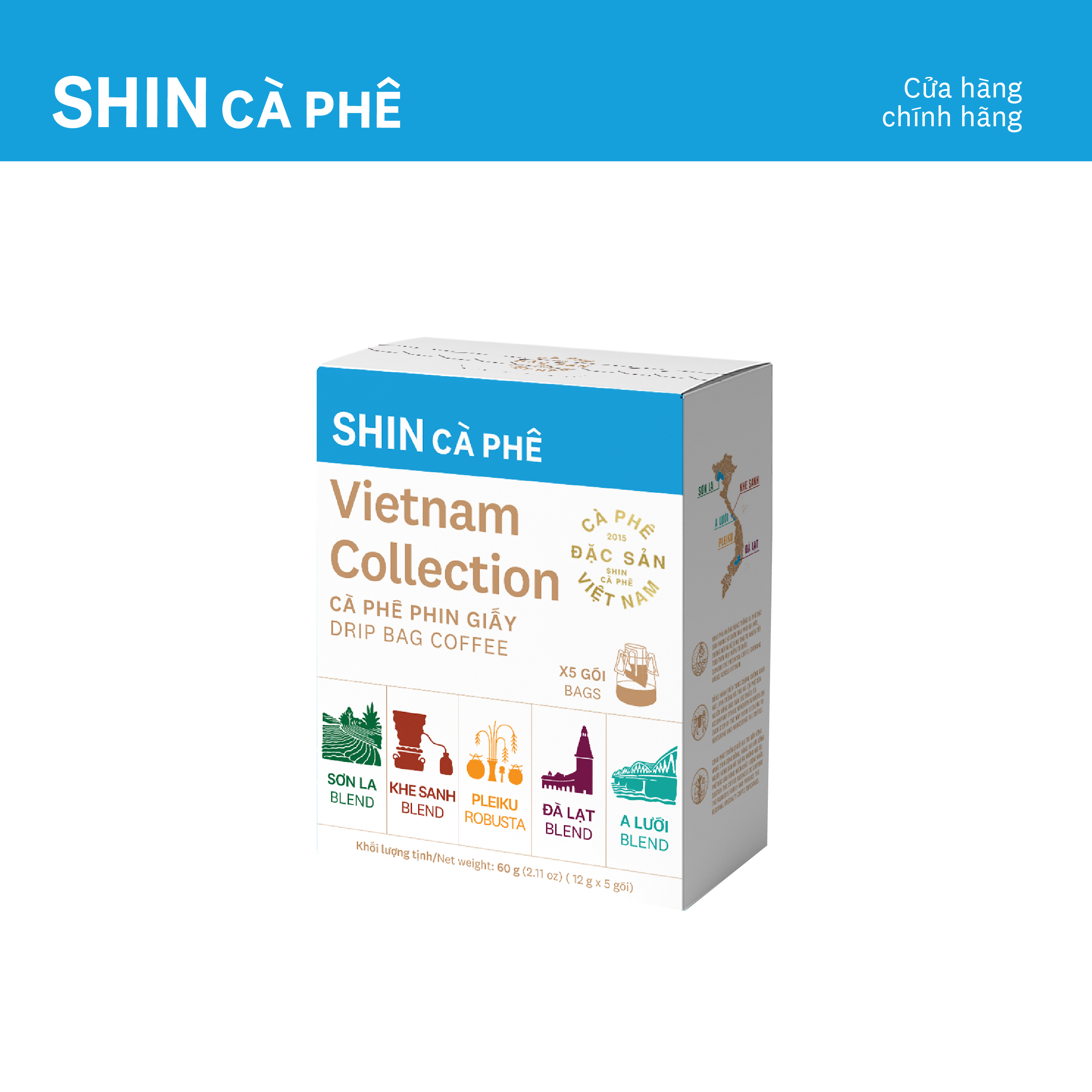 Với mong muốn giúp bạn dễ dàng thưởng thức trọn vẹn bản sắc cà phê từ khắp các vùng miền, Vietnam Collection 5 ra đời như một hộp quà đặc biệt, chứa đựng 5 hương vị phin giấy đại diện cho các vùng cà phê tiêu biểu: Đà Lạt – Sơn La – Khe Sanh – A Lưới và SHIN Blend. Mỗi loại là một câu chuyện bản địa – từ núi rừng Tây Bắc, cao nguyên miền Trung đến cao nguyên Lâm Viên và cả sự hòa trộn tinh tế từ các vùng trồng trên thế giới.