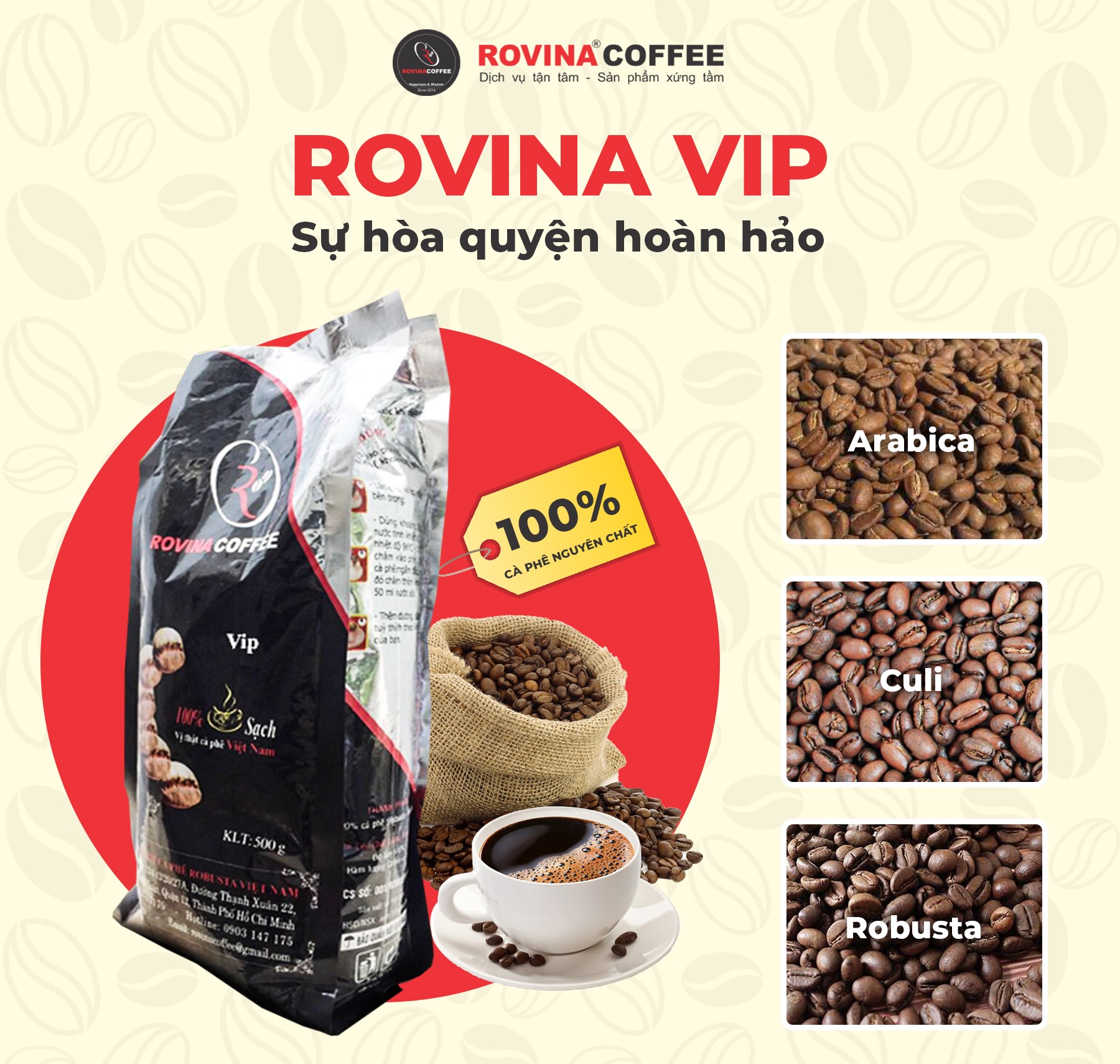 Cà Phê Rovina VIP Pha Phin - Gói 500gr ( Xay Sẵn) Mùi Vị Đặc Trưng Cân Bằng Phù Hợp Với Khách Hàng Thích Uống Cafe Có Mùi Thơm Quyến Rũ, Chua Nhẹ. Đúng Gu Âu