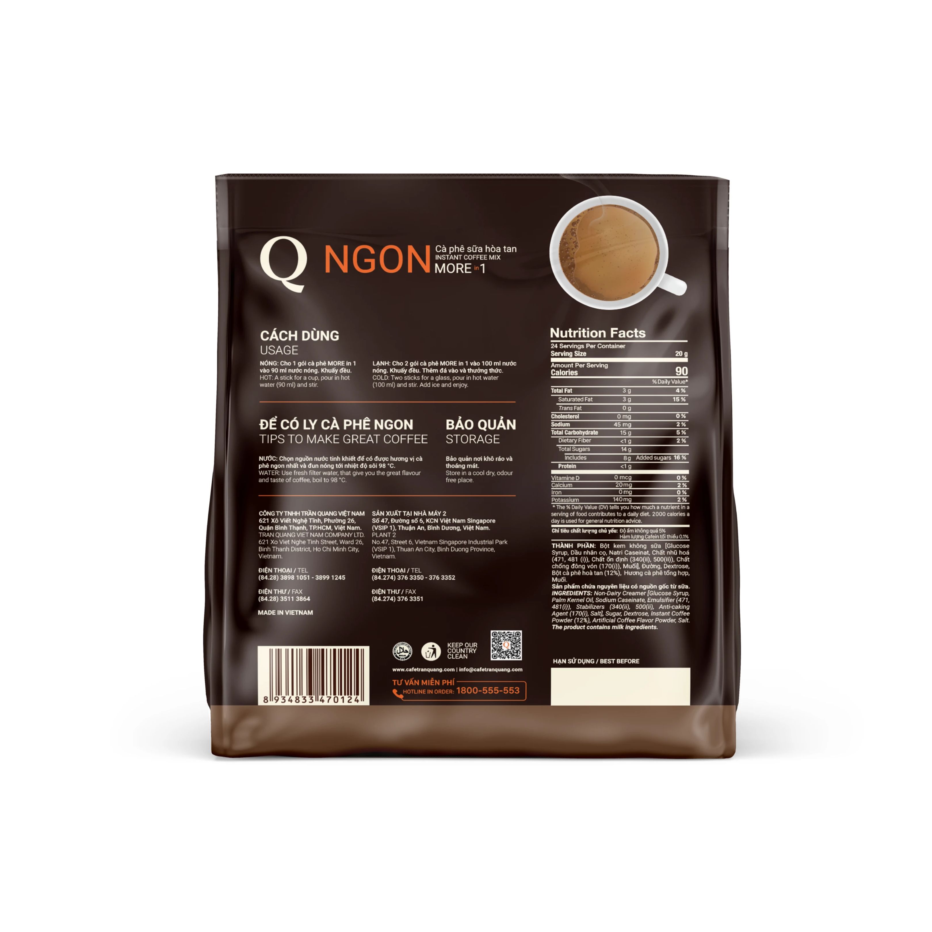 Thông số kỹ thuật Cà phê Trần Quang NGON cafe sữa uống liền bịch 24 gói