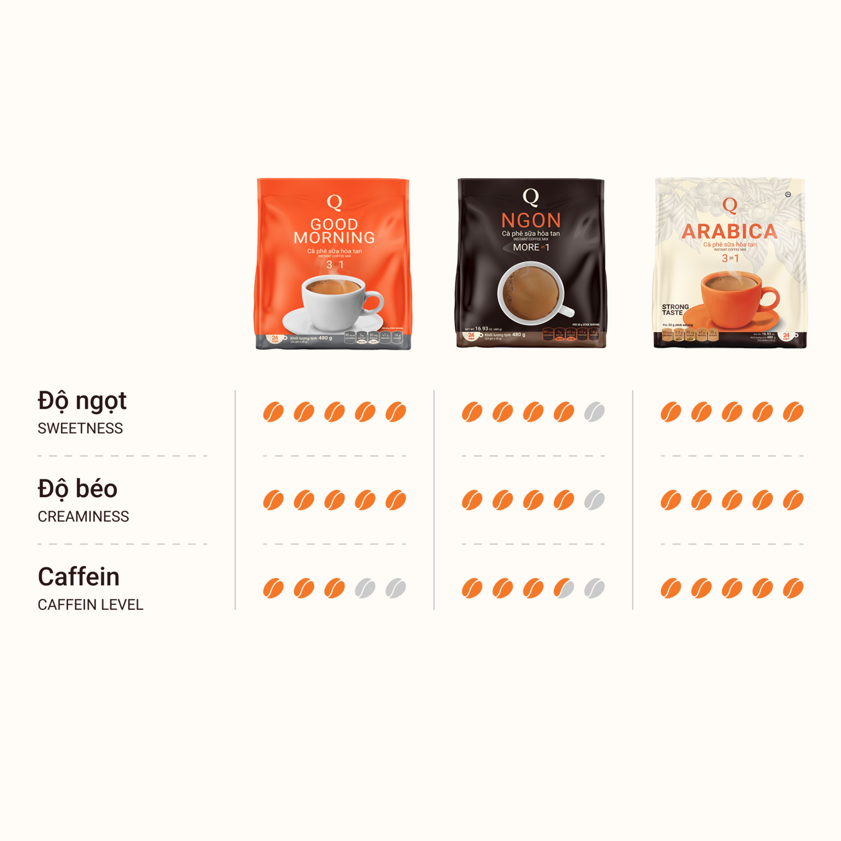 Cà phê hòa tan 3 in 1 Q Express Ngon - đậm vị cà phê với mùi vị béo mịn pha chút ngọt dịu - mang đến một giải pháp cho ngày dài năng động và tích cực của bạn. Với đóng gói tiện ích, chỉ cần vài phút bạn đã có thể thưởng thức một tách cà phê thơm mịn đậm đà. Dòng cà phê 3 in 1 Q Express Ngon chính là sự lựa chọn tiện dụng dành cho bạn mang bên mình đến bất kỳ đâu.