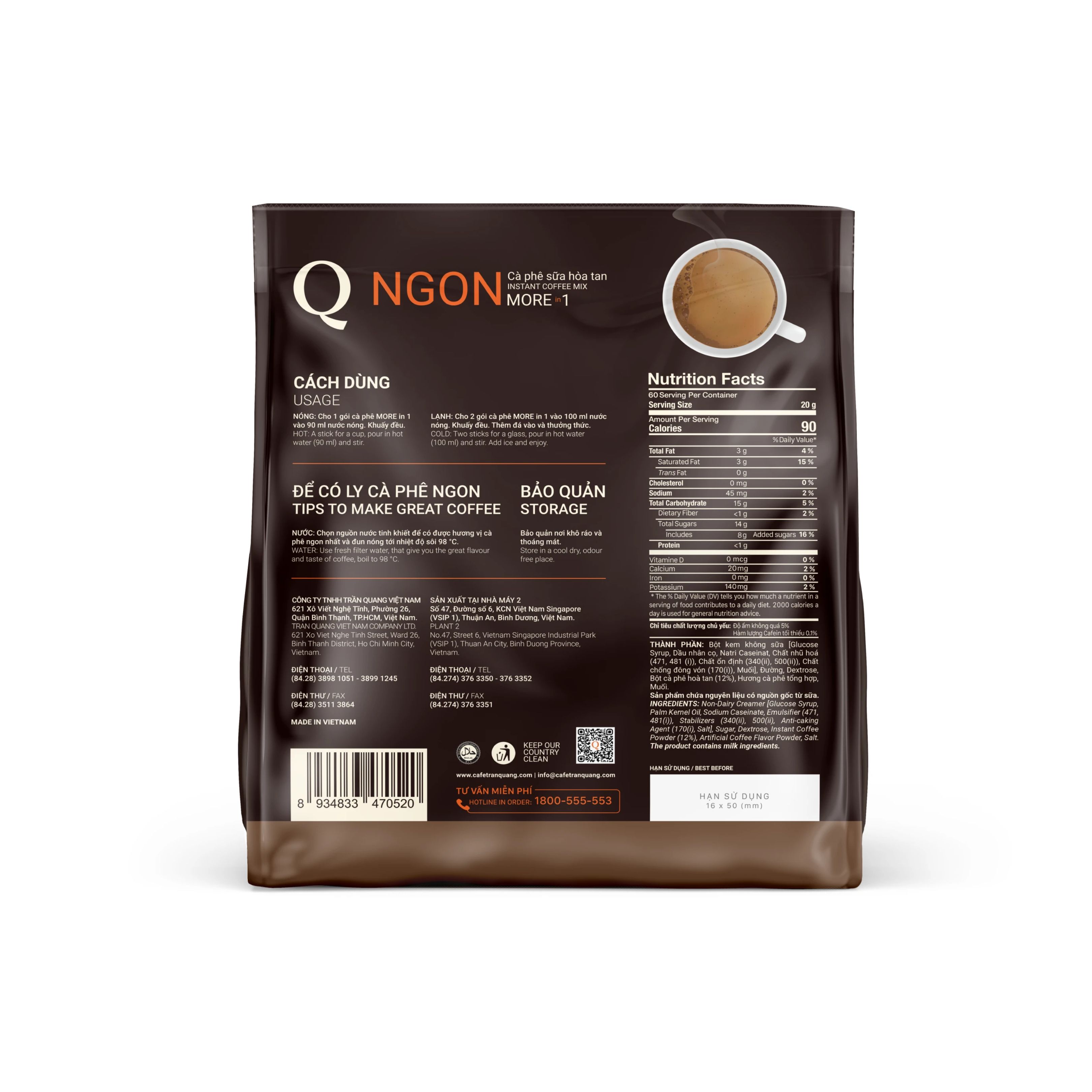 Cà phê hòa tan 3 in 1 Q Express Ngon - đậm vị cà phê với mùi vị béo mịn pha chút ngọt dịu - mang đến một giải pháp cho ngày dài năng động và tích cực của bạn. Với đóng gói tiện ích, chỉ cần vài phút bạn đã có thể thưởng thức một tách cà phê thơm mịn đậm đà. Dòng cà phê 3 in 1 Q Express Ngon chính là sự lựa chọn tiện dụng dành cho bạn mang bên mình đến bất kỳ đâu.