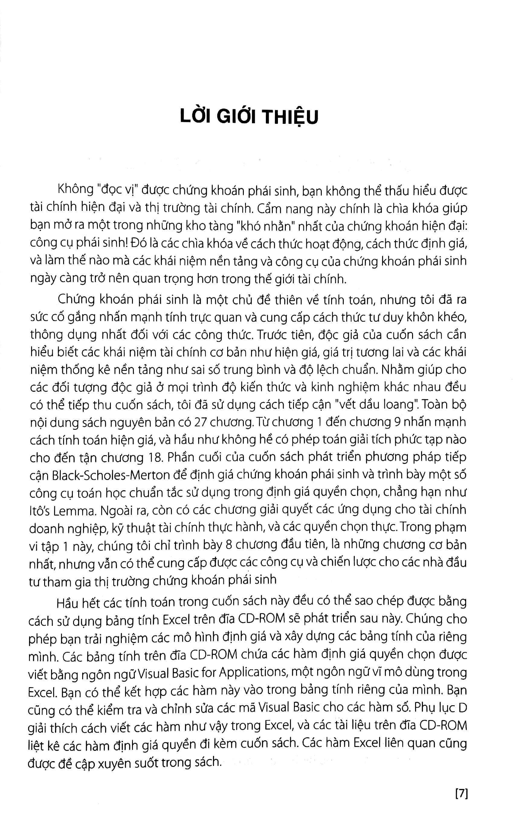 Cuốn sách này giới thiệu về các sản phẩm và các khái niệm cơ bản của chứng khoán phái sinh. Trong chương đầu, chúng tôi giới thiệu một số khái niệm quan trọng và cung cấp bối cảnh để đặt chứng khoán phái sinh vào đó. Khởi đầu, chúng tôi định nghĩa chứng khoán phái sinh là gì. Sau đó, chúng tôi đánh giá ngắn gọn các thị trường tài chính và nhận định các thị trường phái sinh đang ngày càng quan trọng hơn trong những năm gần đây. Quy mô của các thị trường này có thể khiến cho bạn thắc mắc là chính xác thì chúng cung cấp các chức năng nào. Kế đó chúng ta sẽ thảo luận về vai trò của các thị trường tài chính trong cuộc đời mình, và tầm quan trọng của việc chia sẻ rủi ro. Chúng ta cũng thảo luận các quan điểm khác nhau về chứng khoán phái sinh. Cuối cùng, chúng ta sẽ luận bàn về cách thực hiện giao dịch, cung cấp một số khái niệm và ngôn ngữ cơ bản có ích cho các chương sau.