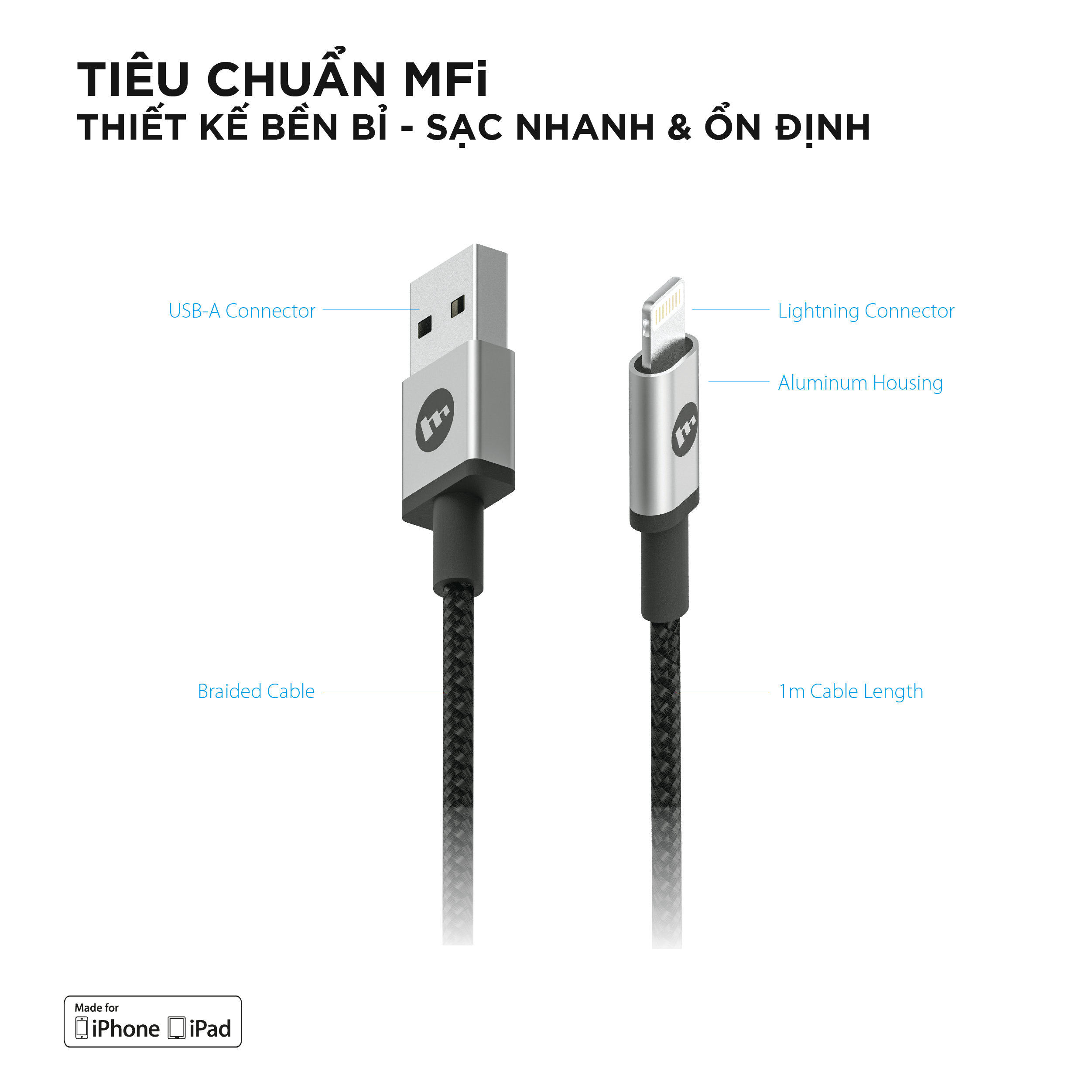 - Cổng kết nối Lightning đạt chứng nhận MFI từ Apple - Ngoài ra cáp Mophie còn được thiết kế đảm bảo tốc độ kết nối nhanh và hiệu suất cao có thể khi kết nối các thiết bị Apple