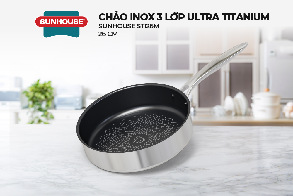 Thân chảo làm từ chất liệu Inox 3 lớp nguyên khối dày dặn liền đáy giúp chảo có độ bền tốt, không han gỉ và chống phồng đáy dù tiếp xúc nhiệt độ cao liên tục. Bạn có thể hoàn toàn an tâm sử dụng Chảo Inox 3 lớp Ultra Titanium Sunhouse STIM lâu dài vì độ bền đẹp, an toàn với sức khỏe. Chảo được sử dụng để chiên và xào linh hoạt cho nhiều món ăn khác nhau.