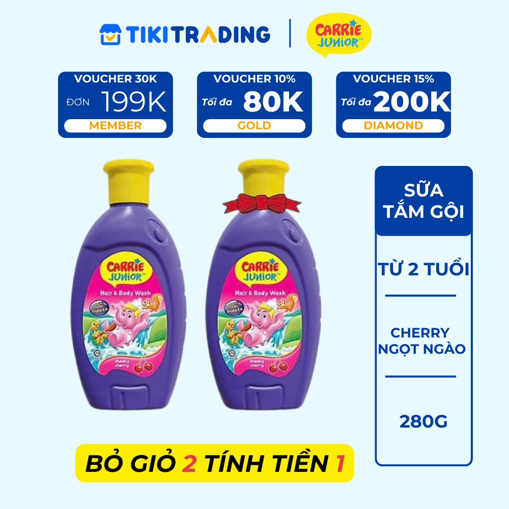 Sữa Tắm Gội Toàn Thân Carrie Junior Hương Grapeberry (280g) với công thức đặt biệt chứa chiết xuất từ sữa bò tươi nguyên chất và sữa đậu nành thiên nhiên nhẹ nhàng làm sạch tóc, da đầu và toàn thân.