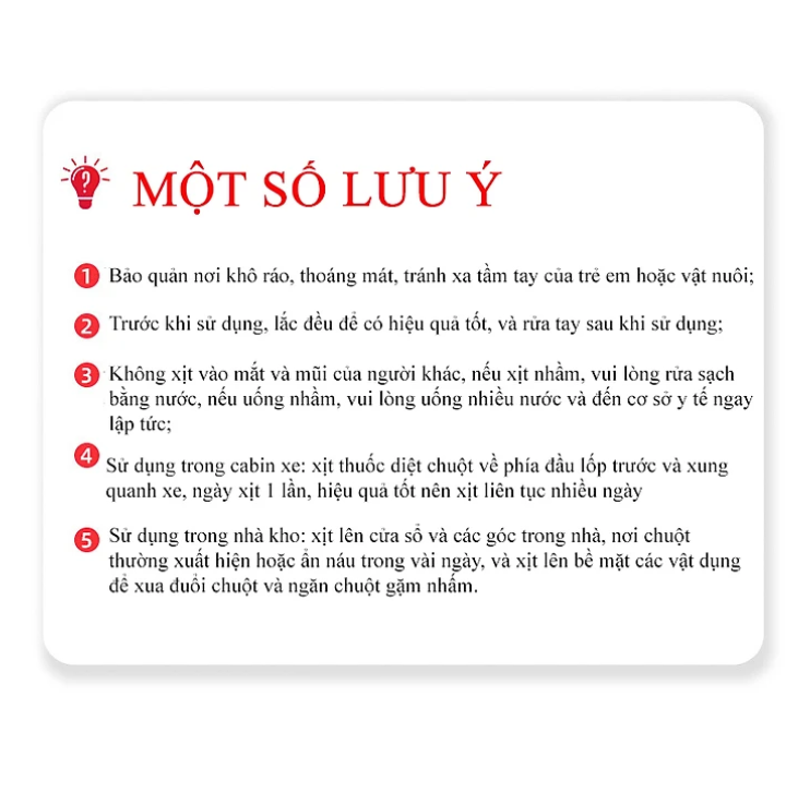 - Xịt 3-4 lần/tuần ở các ngóc ngách trong phòng, văn phòng có diện tích nhỏ hoặc gầm, khoang ô tô, những nơi chuột thường trú cho đến khi hết chuột.