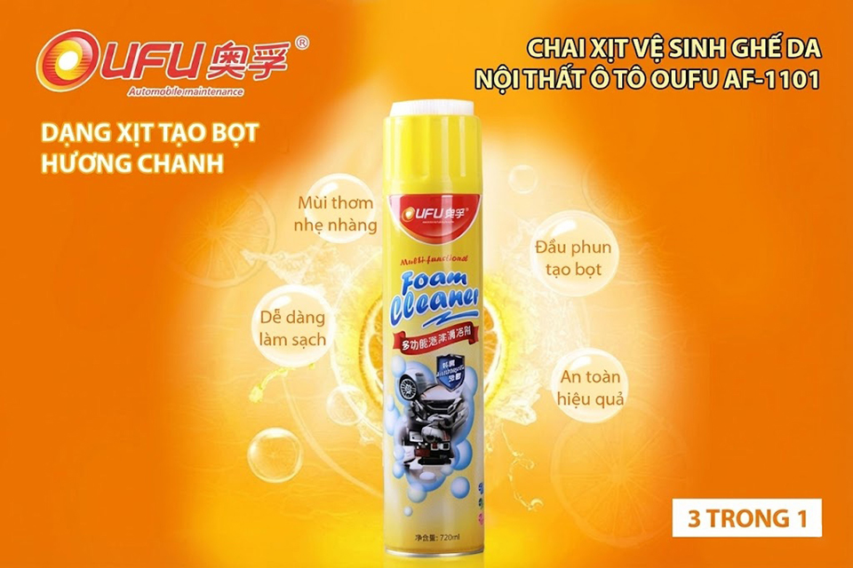 - Chai xịt vệ sinh ghế da nội thất ô tô OUFU AF-1101 720ml với công thức tiên tiến đặc biệt, nhanh chóng làm sạch và khử mùi bên bộ nệm cao cấp trong xe của bạn.