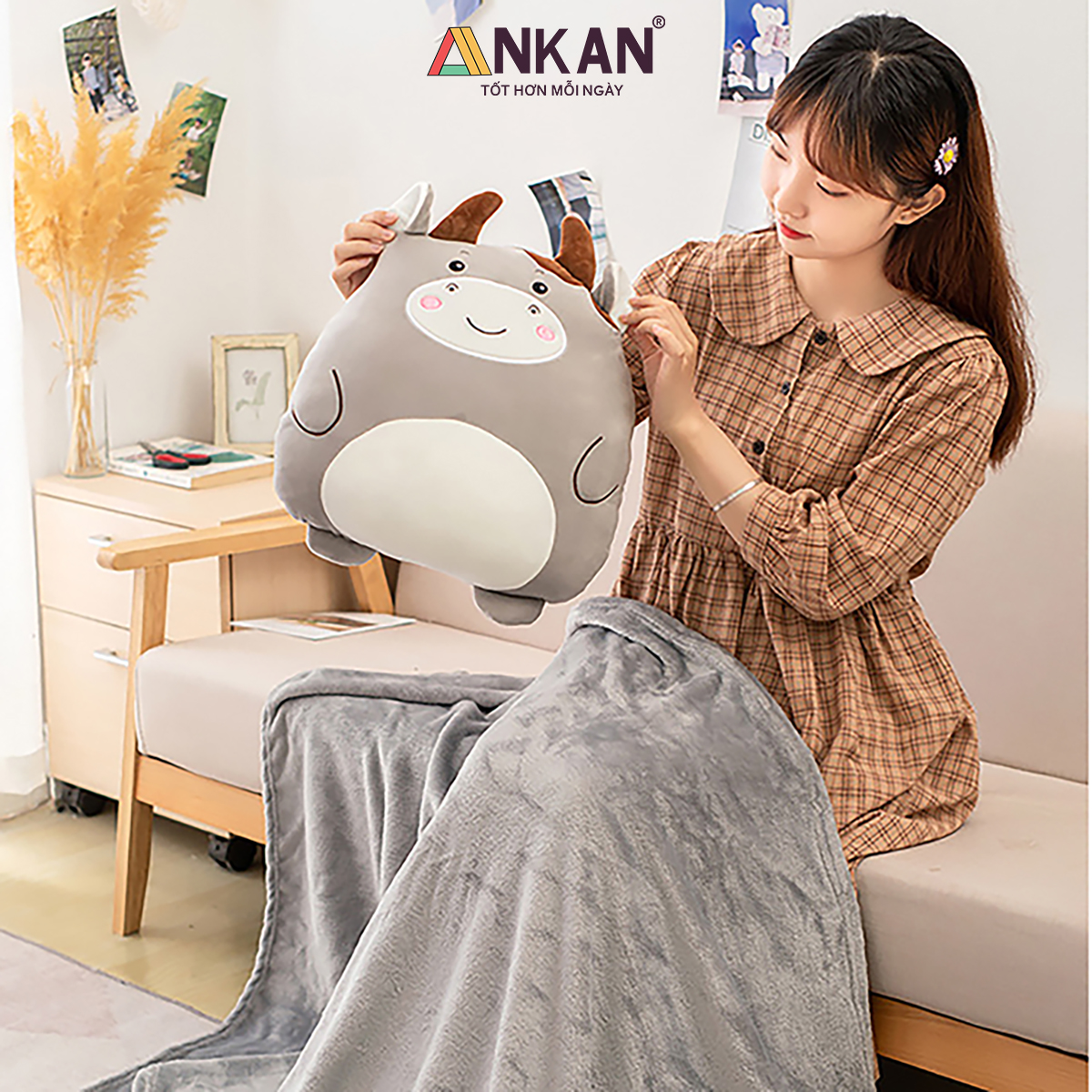 Bộ chăn gối văn phòng 3 trong 1 kiểu bò cute là thiết kế mới được nhiều bạn yêu cầu, nên ANKAN mang về để phục vụ mọi người.