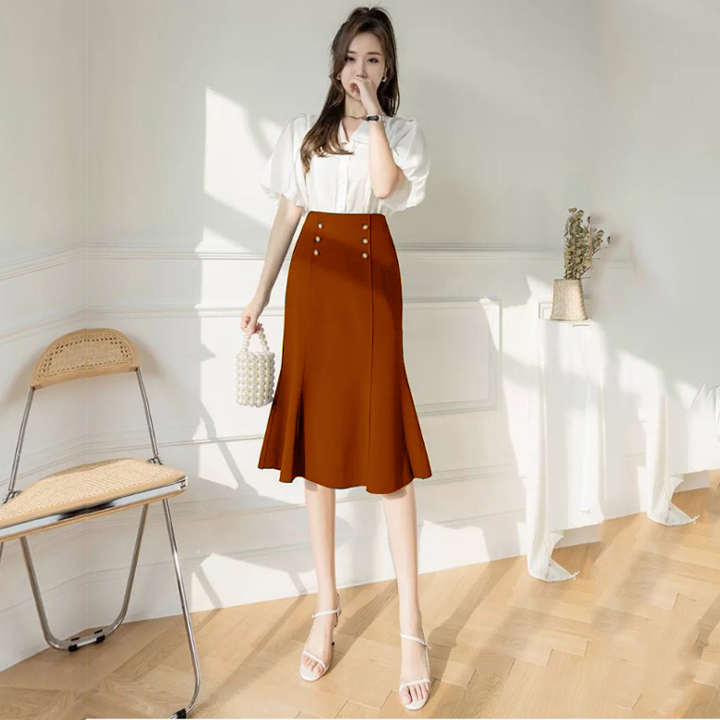 Chân váy được thiết kế dài qua gối dáng đuôi cá thoải mái cho việc đi lại.