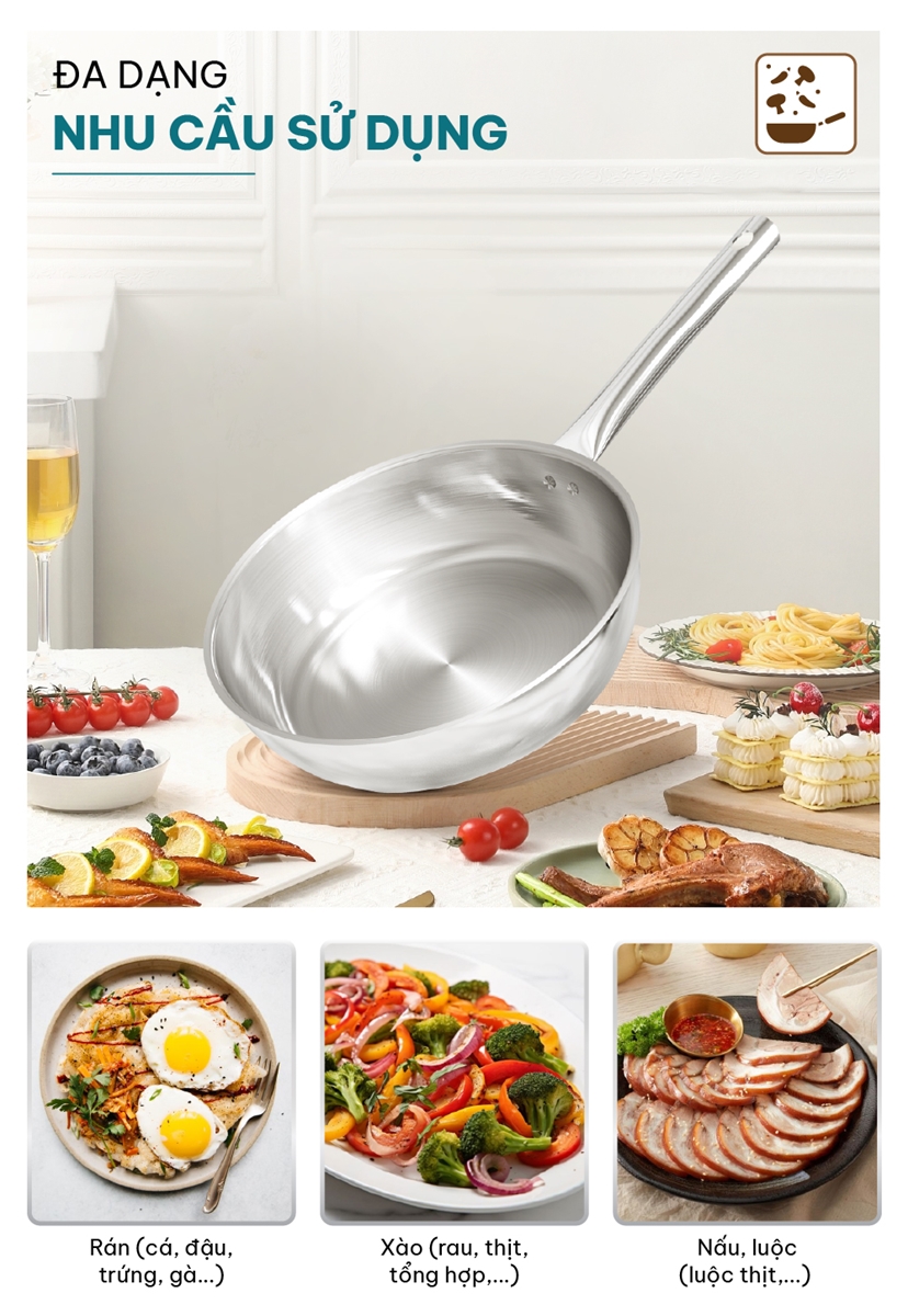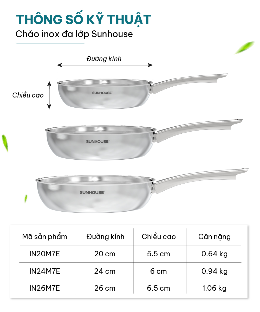 Thông số kỹ thuật Chảo Inox liền khối Sunhouse Healthy IN20-24-26M7E - 3 lớp inox liền khối - Dùng cho mọi loại bếp