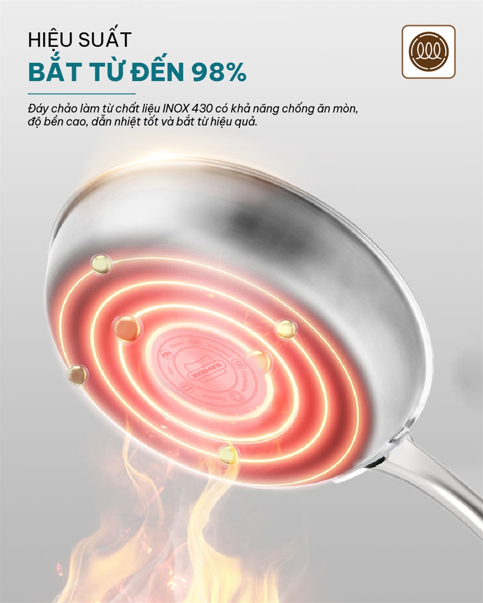 Chảo Inox liền khối Sunhouse Healthy IN20M7E - IN24M7E - IN26M7E - Dùng cho mọi loại bếp