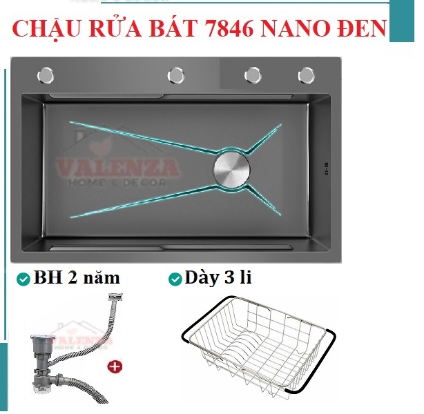 Thông số kỹ thuật Chậu rửa bát 1 hố Valenza 7846 inox 304 nano đen dày 3li kèm bộ xả ngăn mùi, khay inox, rổ lỗ inox-Hàng chính hãng