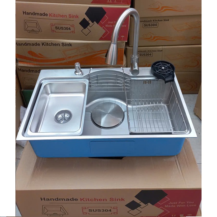 Combo chậu vòi rửa chén bát 1 hố lớn 7546 Valenza inox304 100% dạng ĐÚC khuyết dày 5li đầy đủ chậu, vòi, bộ xả chậu, khay inox kín như 1 chậu rửa nhỏ, bình đựng nước rửa chén gắn chậu, rổ inox lỗ, dụng cụ rửa ly cốc là lựa chọn đầy đủ và chất lượng, tăng thẩm mỹ và tính hiện đại cho gian bếp của gia đình bạn.