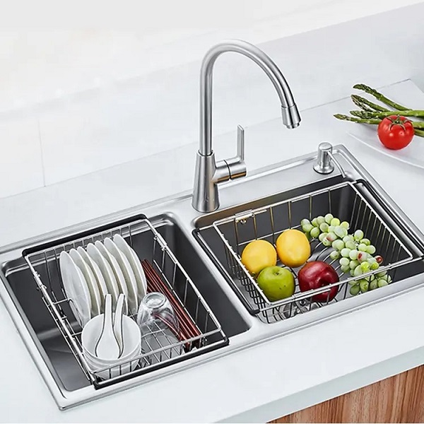 6. Rổ inox lỗ: gác trên chậu, co giãn linh hoạt, để úp bát đĩa, cốc chén, rau củ sau khi rửa, ráo nước trực tiếp xuống chậu rửa bát rất tiện lợi vệ sinh