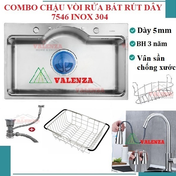 Combo bao gồm: chậu rửa chén bát 1 hố lớn Valenza size 7546 inox 304 100% dạng ĐÚC thành dày 5li, hố chậu 1li, thiết kế kiểu khuyết Hàn Quốc, vòi rửa bát rút dây Valenza sus304, bộ xả to ngăn mùi, khay inox kín, bình rửa bát, dụng cụ rửa ly cốc.