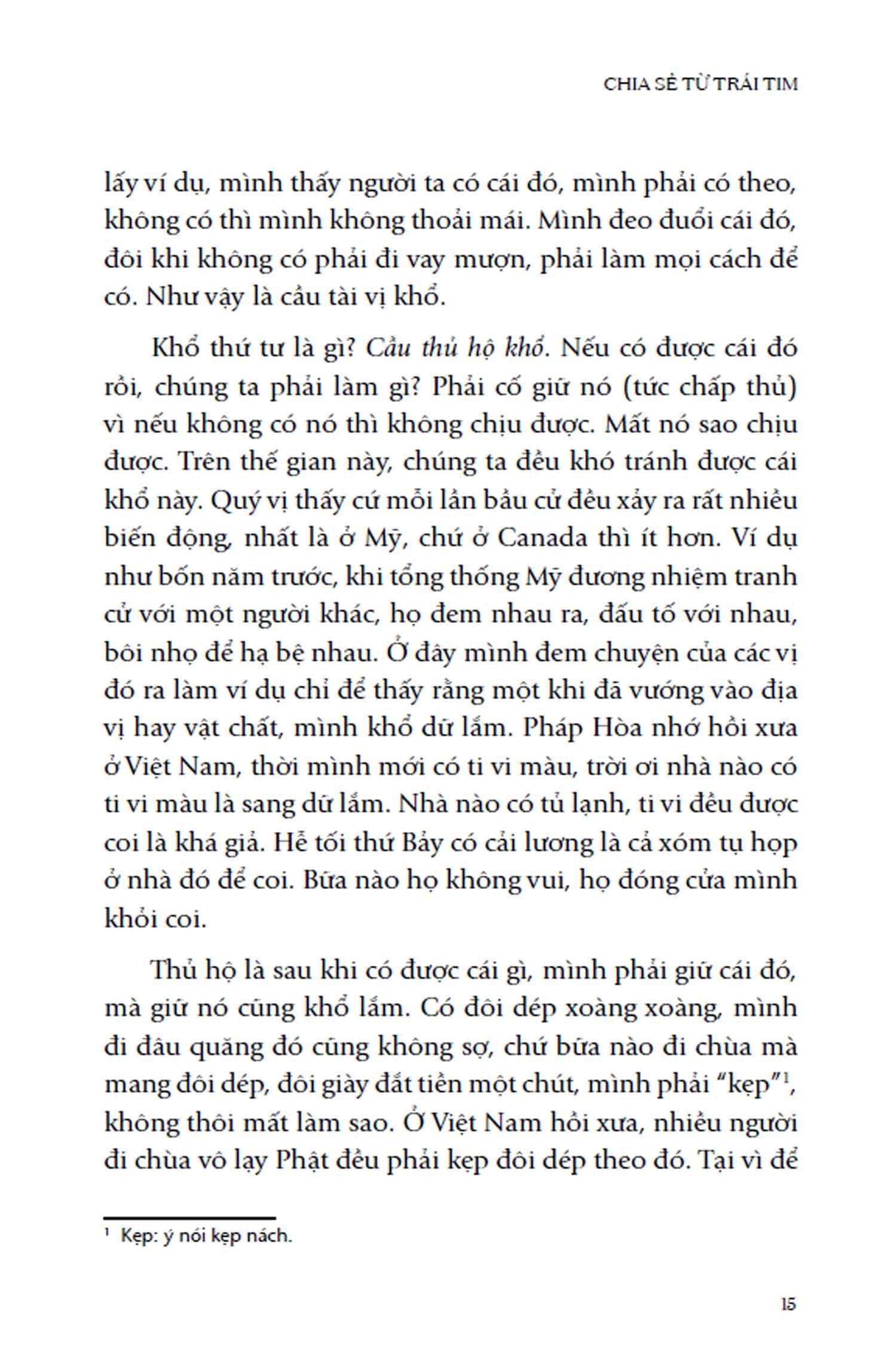 Chia sẻ từ trái tim là một tuyển tập từ hàng trăm bài pháp thoại của Sa Môn Thích Pháp Hòa, được sắp xếp theo các chủ đề nhằm hệ thống lại những khái niệm, tư tưởng căn bản của đạo Phật qua lời giảng gần gũi của thầy, để mỗi người chúng ta có thể đưa vào áp dụng trong chính cuộc sống hằng ngày của m.ình.