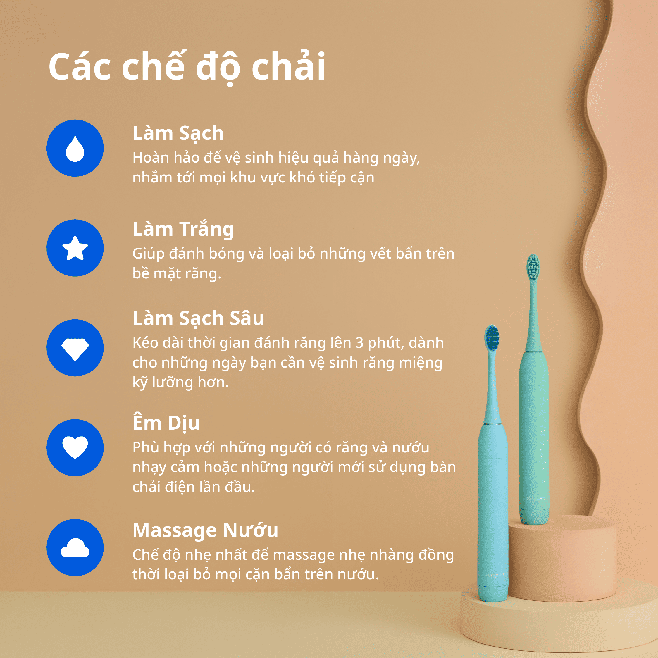 ÊM DỊU: Phù hợp với những người có răng và nướu nhạy cảm hoặc những người mới sử dụng bàn chải điện lần đầu.