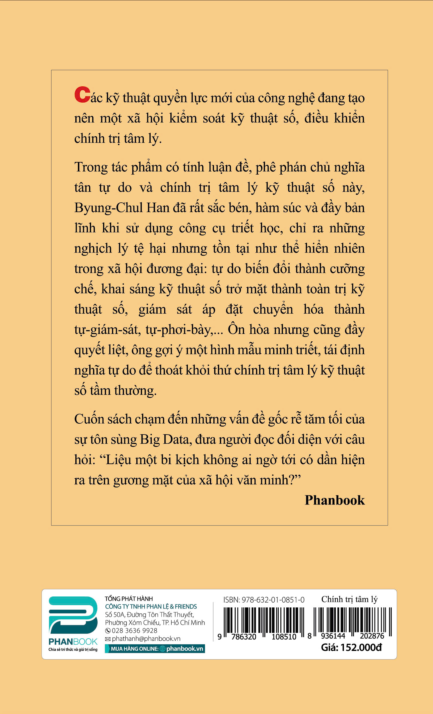 Trong Chính trị tâm lý, cuốn sách thứ hai của triết gia Byung-Chul Han do Phanbook giới thiệu tại Việt Nam (sau cuốn Sự biến mất của nghi thức), độc giả được soi tỏ về một mối nguy cơ hiện hữu trong thời đại mình: Chúng ta đang bị thao túng, và tệ hơn, tự biến mình thành kẻ bị thao túng. Với lối dẫn dắt dễ hiểu, hàm súc mà vô cùng sâu sắc, Byung-Chul Han soi rọi những nghịch lý nhưng tồn tại như thể hiển nhiên trong xã hội đương đại: tự do biến đổi thành cưỡng chế, khai sáng kỹ thuật số trở thành toàn trị kỹ thuật số, giám sát áp đặt chuyển hóa thành tự-giám-sát, tự-phơi-bày…