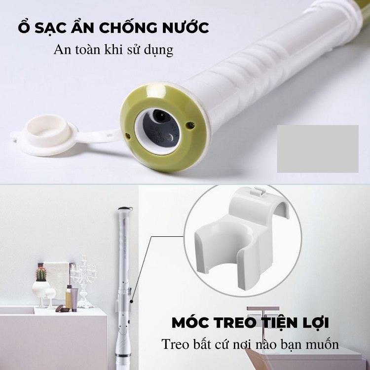 - Trang bị móc treo tiện lợi để dễ dàng cất giữ ngay tại nhà tắm khi không sử dụng hoặc sạc pin, vừa tiện lợi vừa khiến không gian nhà tắm, nhà vệ sinh trở nên "sang chảnh" hơn.