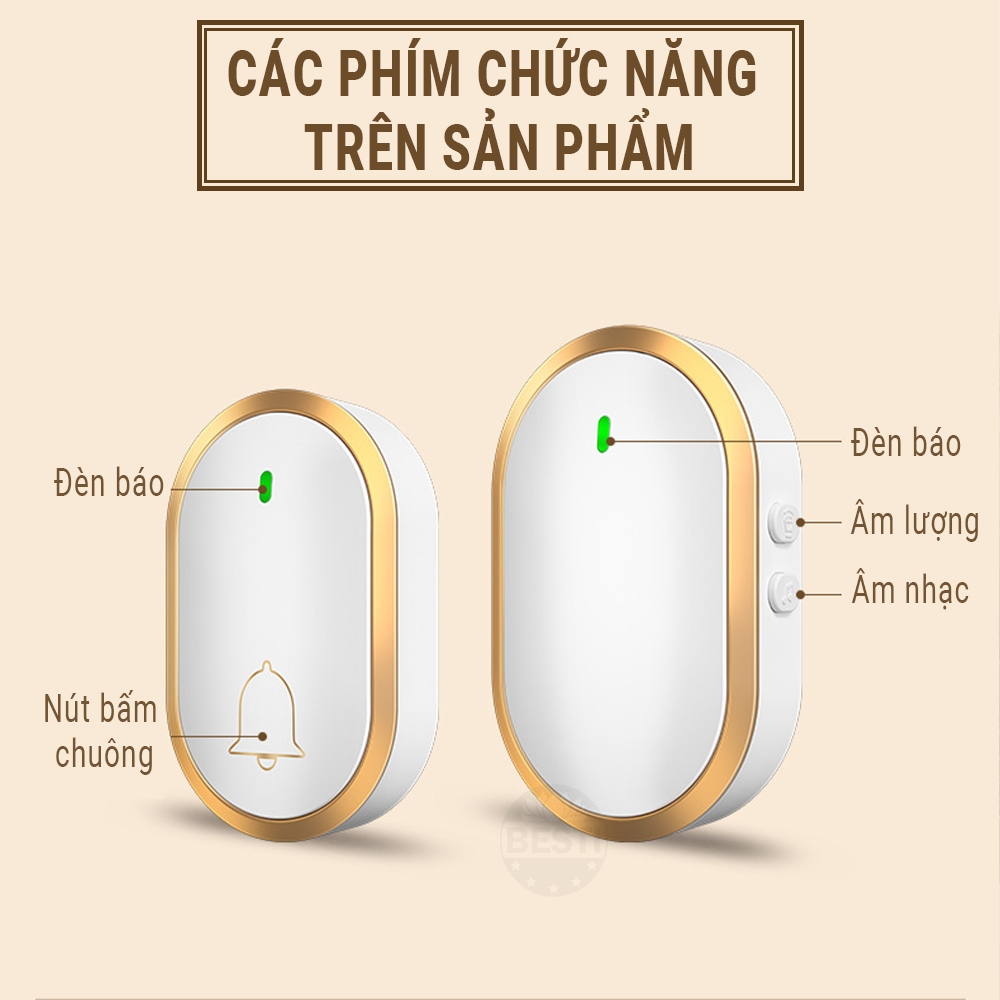 Chuông Cửa Không Dây Thông Minh Besti YBT01 (1 Nút Bấm, 1 Chuông ), Chống Nước, Khoảng Cách Sử Dụng Hiệu Quả 300M, 60 Loại Nhạc Chuông, 4 Mức Điều Chỉnh Âm Lượng - Hàng Chính Hãng