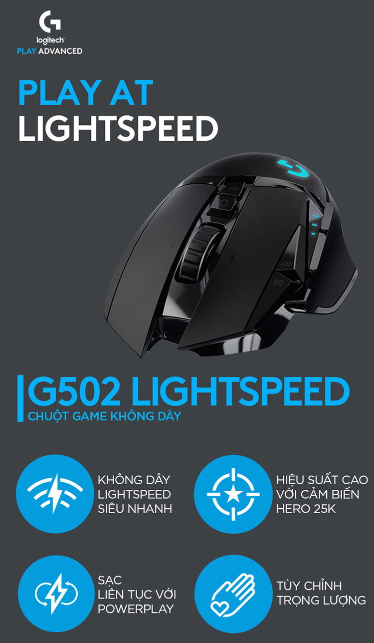 Chuột game không dây Lightspeed Logitech G502 là một biểu tượng, dẫn đầu bảng xếp hạng trong nhiều thế hệ và là lựa chọn của những game thủ nghiêm túc. Giờ đây, G502 gia nhập vào hàng ngũ chuột chơi game không dây tiên tiến nhất thế giới với sự ra đời của G502 LIGHTSPEED. LIGHTSPEED có tốc độ siêu nhanh và ổn định với hiệu suất được các chuyên gia thể thao điện tử tin cậy trong thi đấu. G502 LIGHTSPEED cũng có cảm biến HERO 25K thế hệ mới và tương thích với POWERPLAY. Với công nghệ tiên tiến được đổi mới hoàn chỉnh này, G502 LIGHTSPEED vẫn giữ được hình dáng yêu thích - đồng thời giảm được 7 gram trọng lượng.